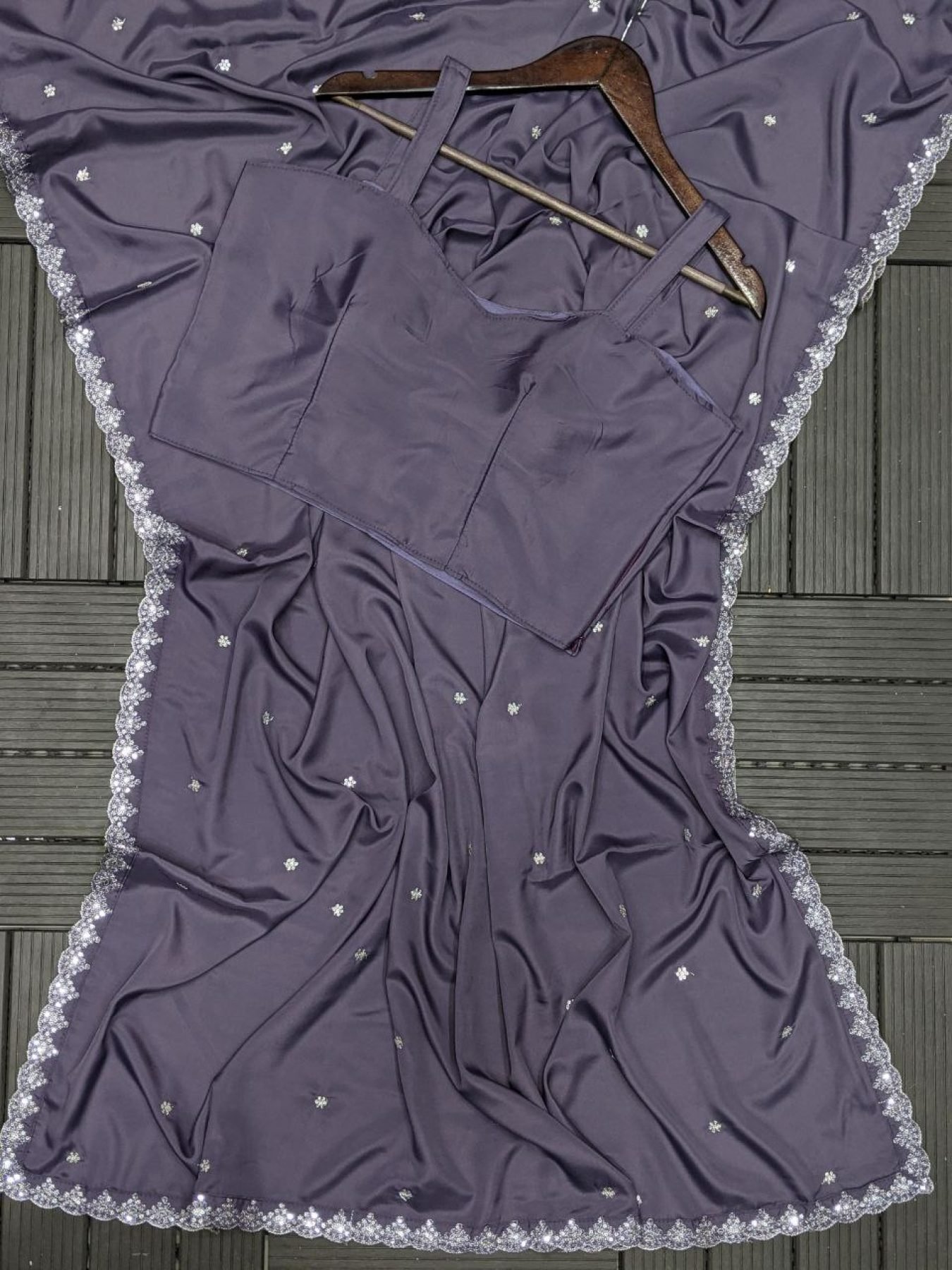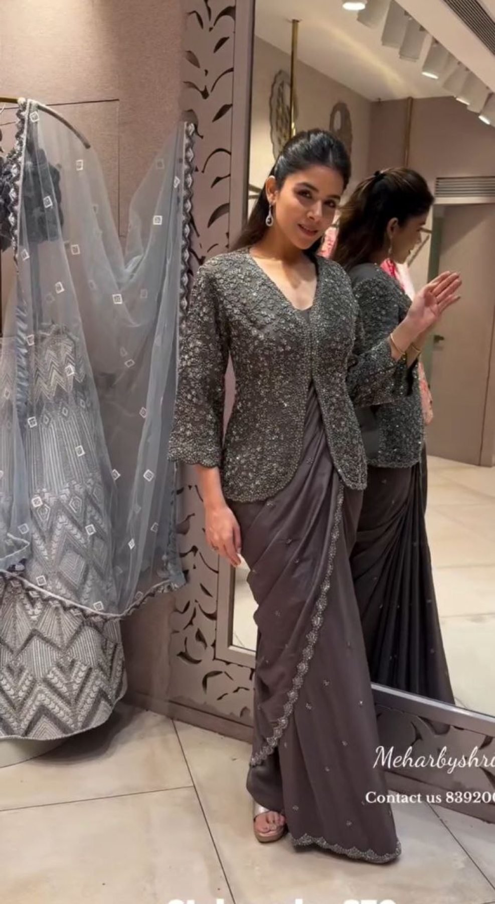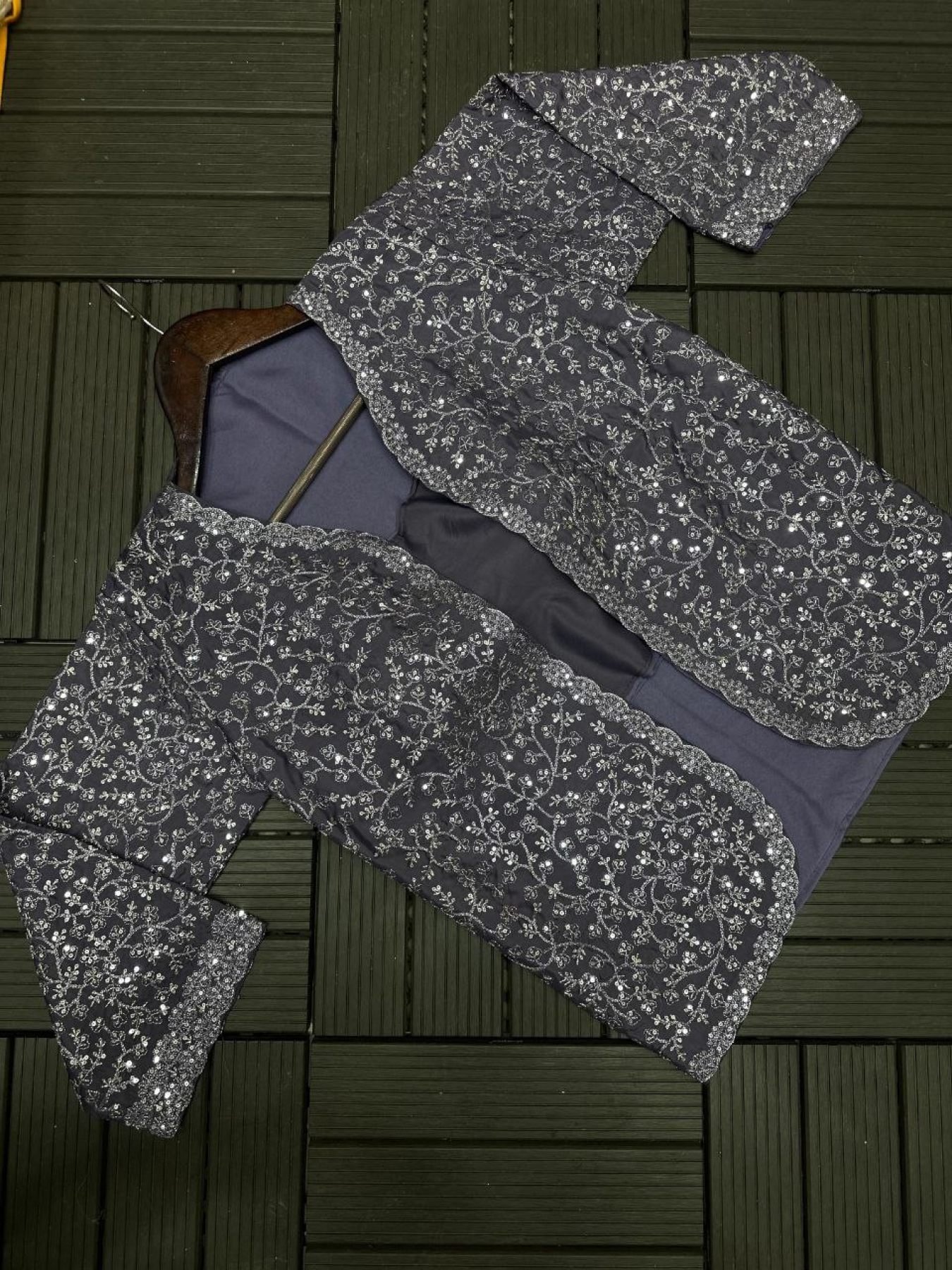 Trendy party wear saree set crafted in heavy crepe satin with full embroidery work, paired with a stylish embroidered koti jacket. A perfect fusion outfit for weddings, parties, and special occasions.