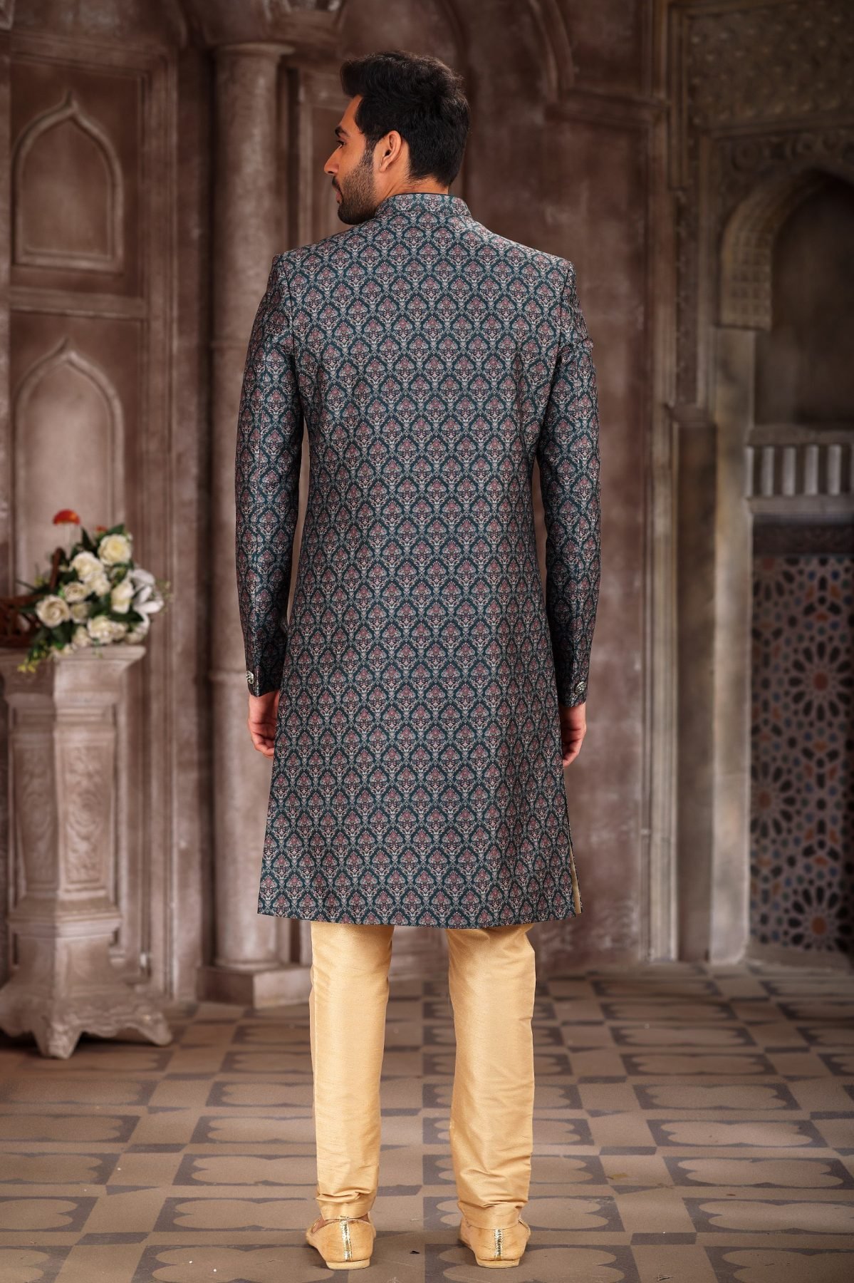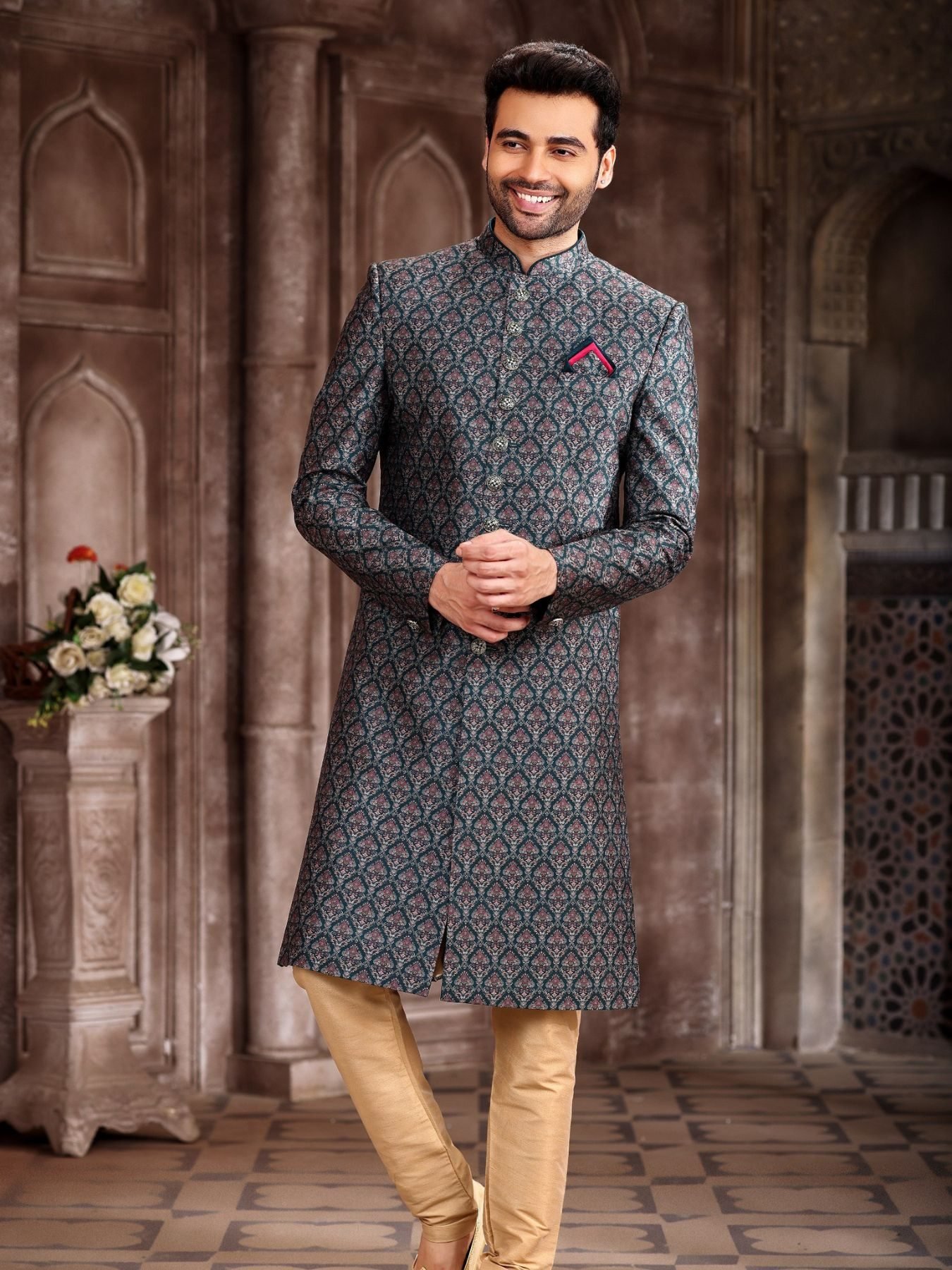 Trendy Drak Green Jacquard Digital Print Sherwani for Wedding Festivals