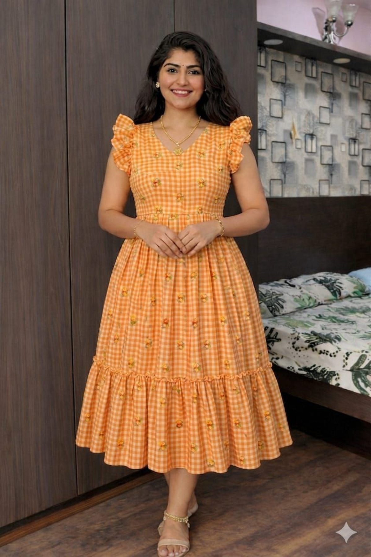 Trendy Orange Chanderi Cotton Silk Long Printed Gown with Elegant Flair