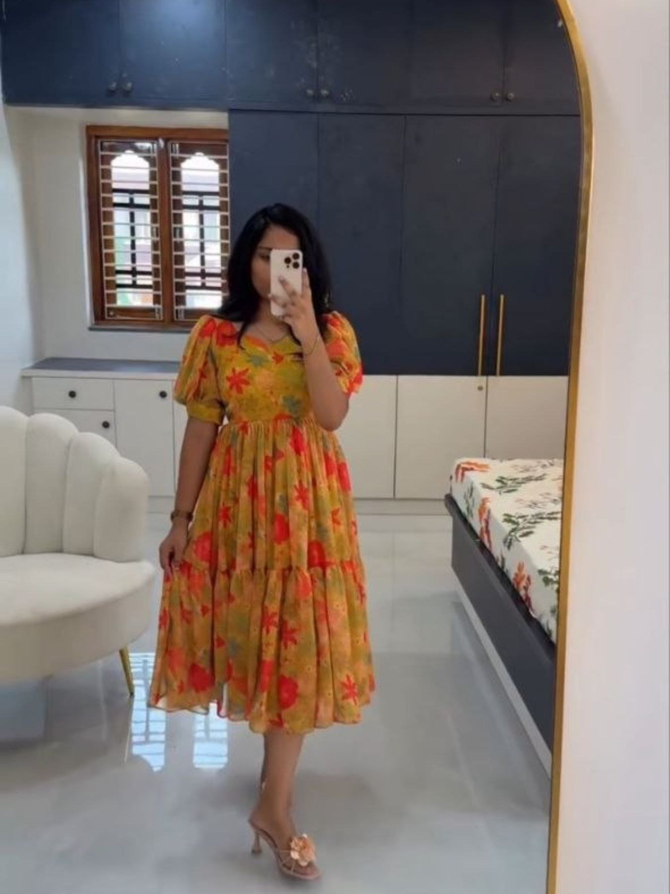 Stylish maxi gown crafted in soft Alfino chiffon fabric with a beautiful print and flowy silhouette. Designed with a waist knot for a perfect fit, this lightweight outfit is ideal for casual wear, outings, and summer occasions.