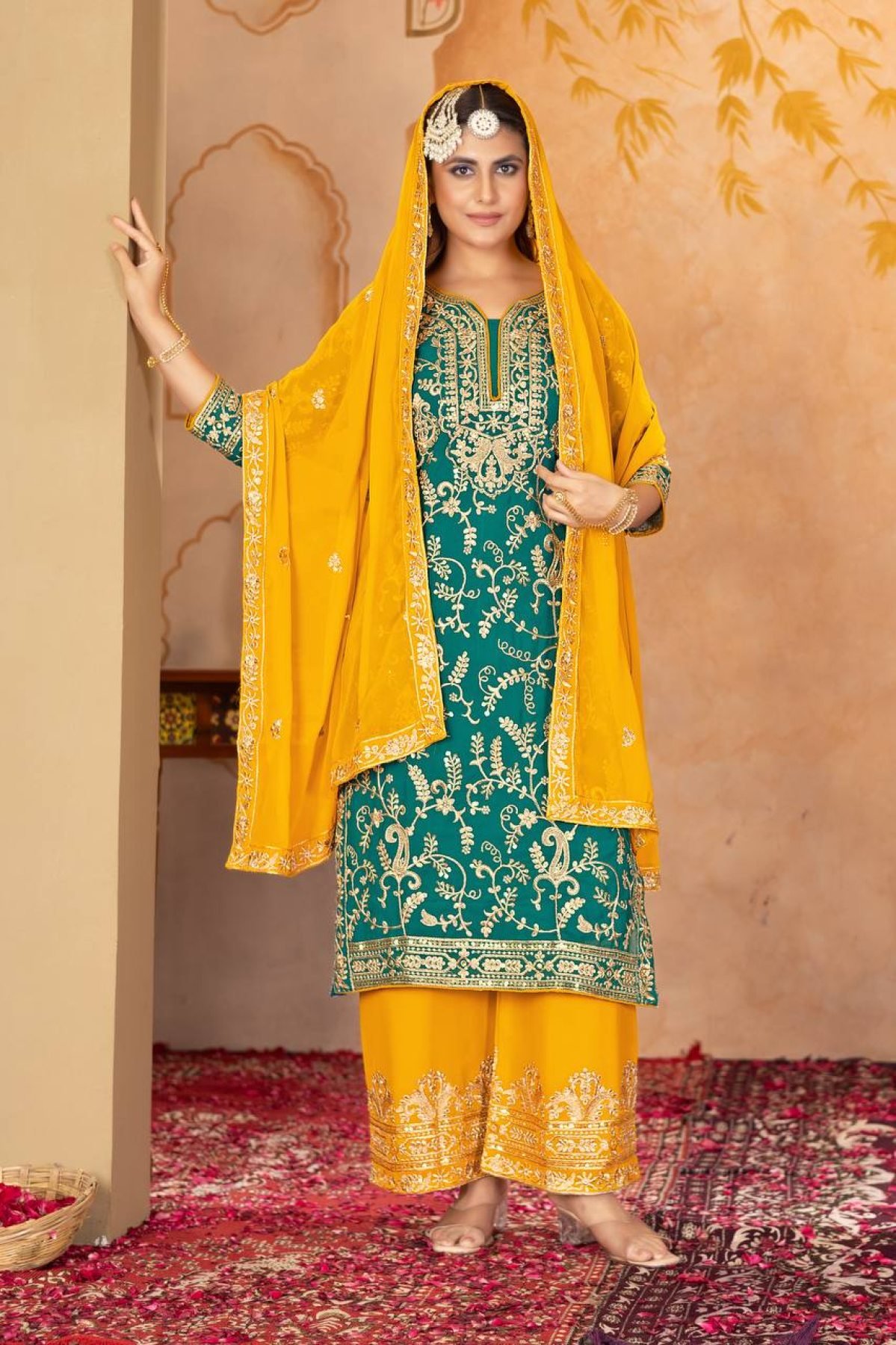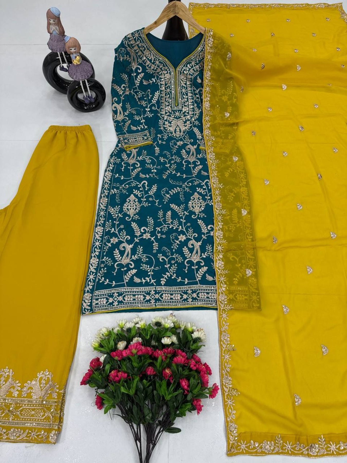Step into elegance with this stunning 3-piece Plazzo Suit Set, made from premium faux georgette fabric with heavy embroidery and sequins work. The top is fully stitched with a flattering fit, paired with a matching embroidered plazzo and dupatta. Designed for festive and party occasions – available at wholesale & manufacturer prices.