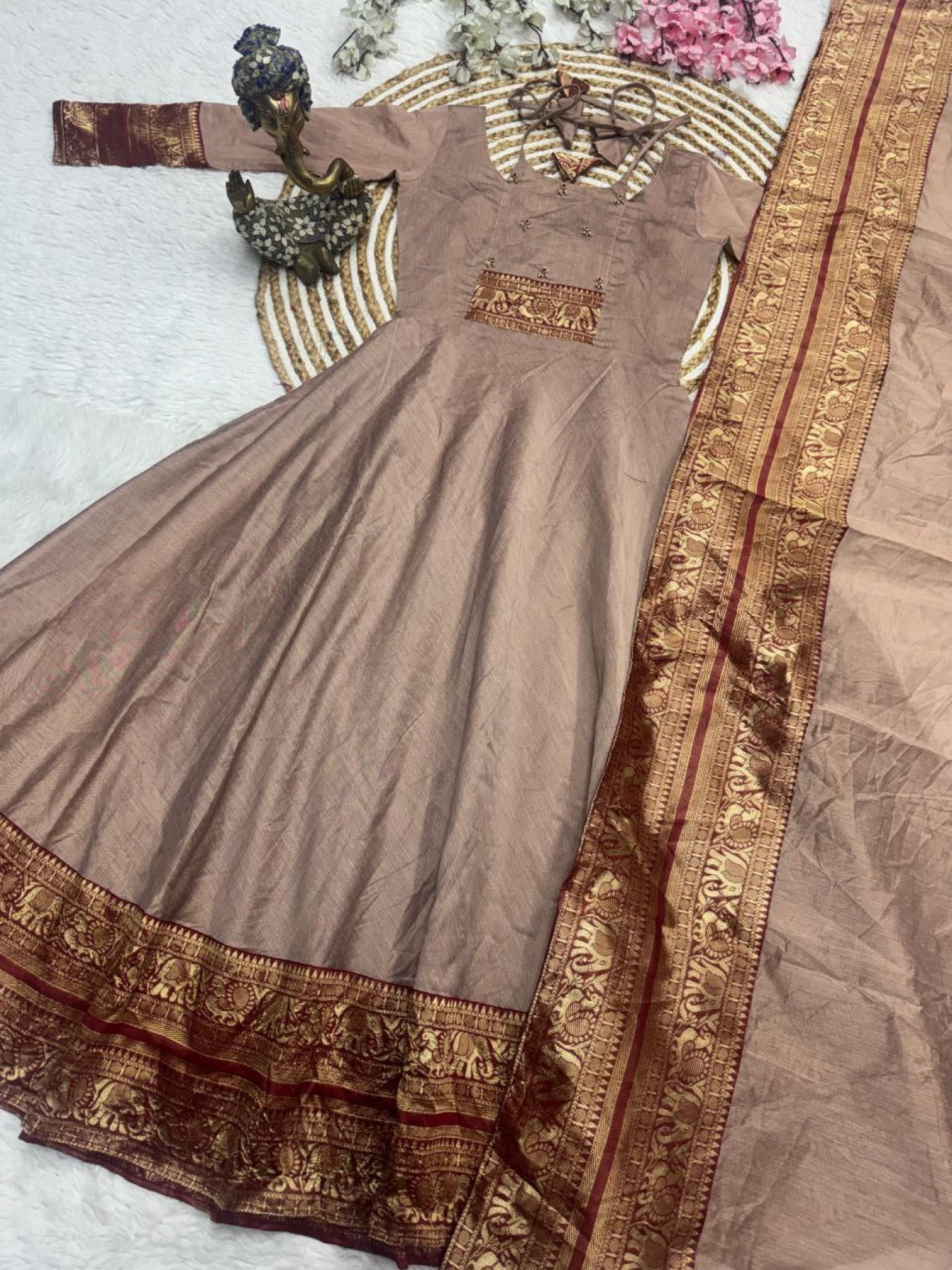Elegant top crafted in premium Pattu cotton fabric featuring beautiful handwork with jacquard weaving zari border. Paired with a stylish dupatta with lace border, this outfit offers a perfect blend of traditional charm and modern elegance for festive wear and special occasions.