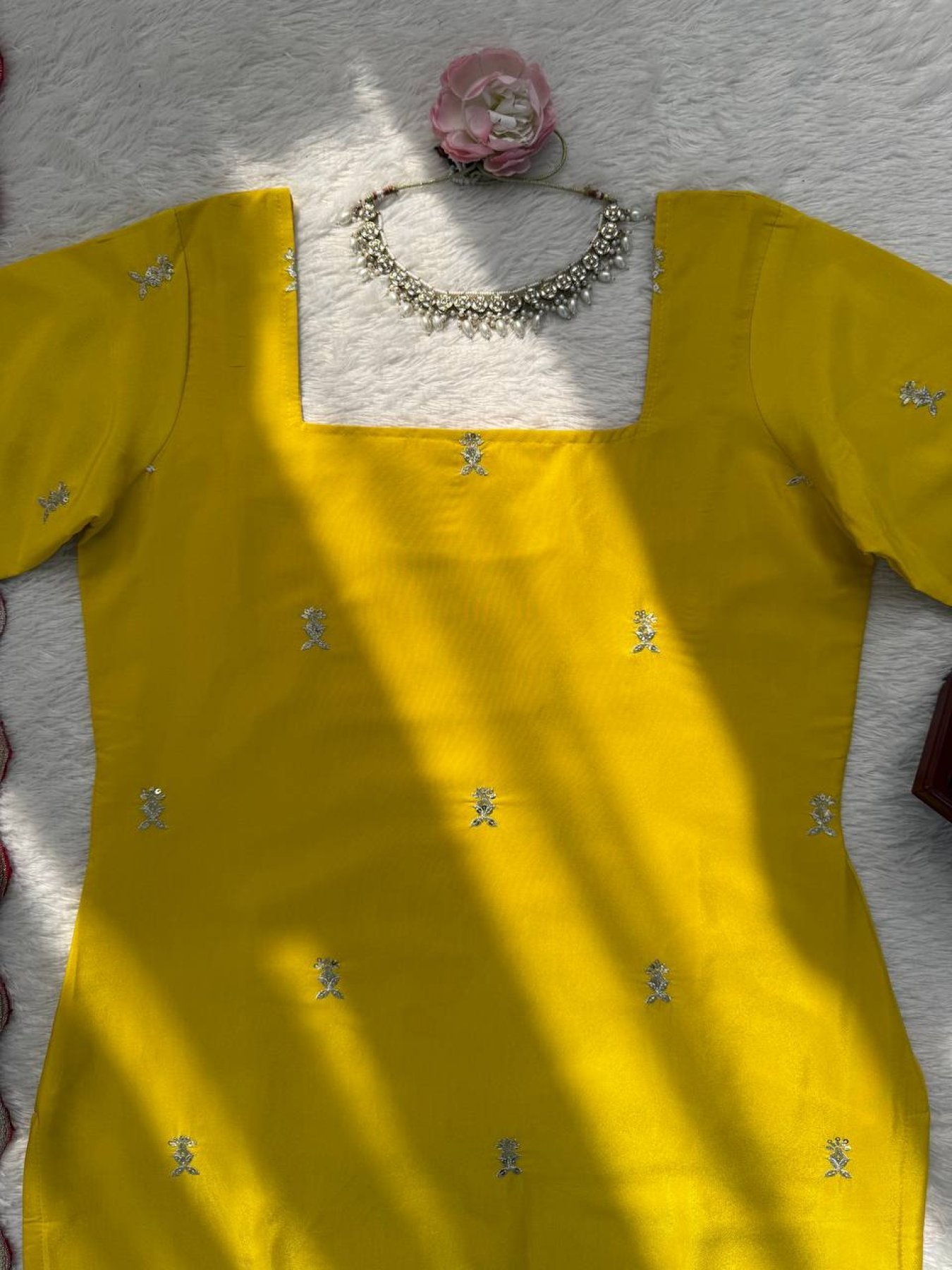 Elegant sharara suit set crafted from natural crepe silk featuring intricate thread and sequence embroidery on the top and dupatta. Paired with a comfortable fully stitched sharara with elastic waistband and soft micro cotton lining.