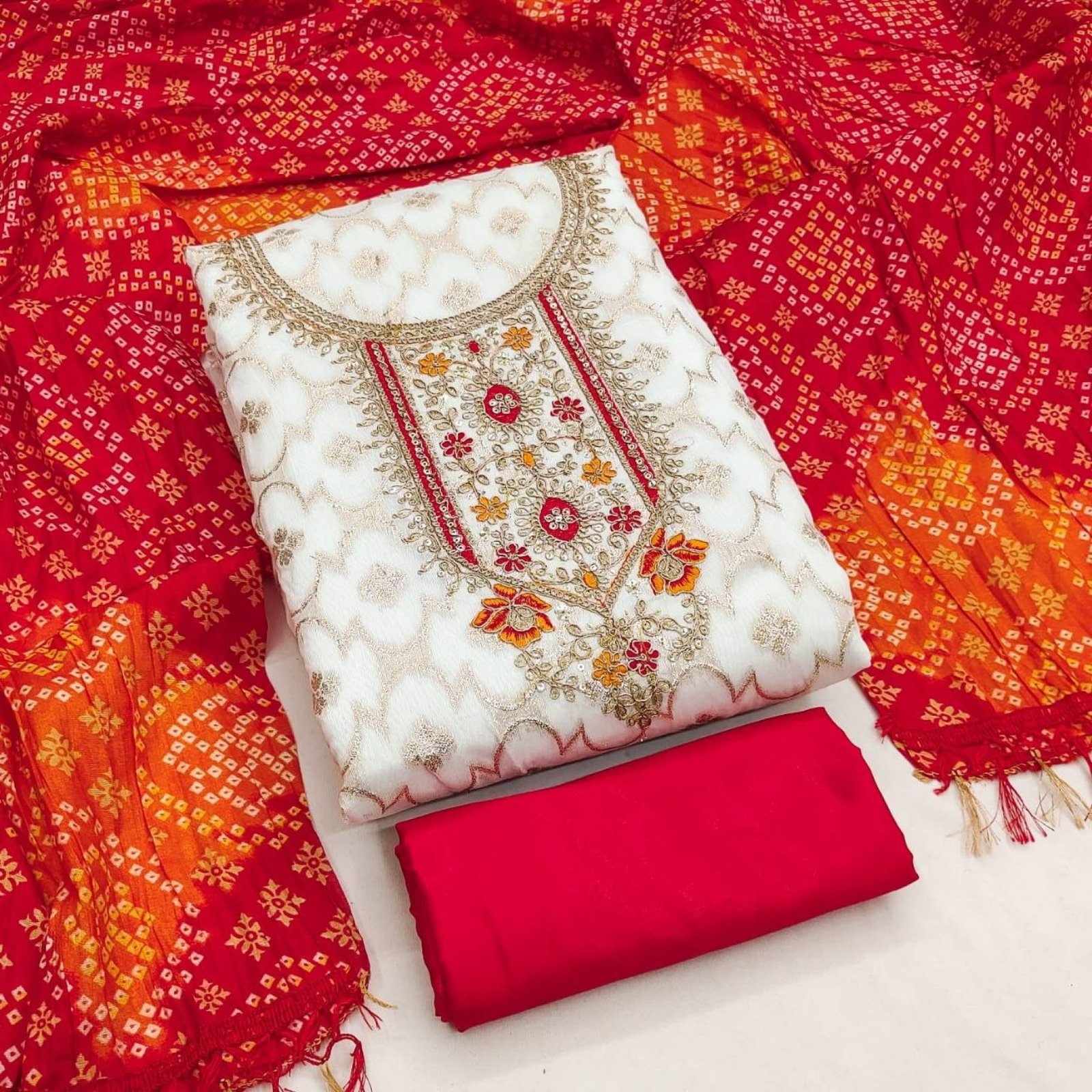 Affordable chanderi jacquard dress material with sequins work top, santoon bottom, and printed chinon dupatta. Ideal for festive and daily ethnic wear.