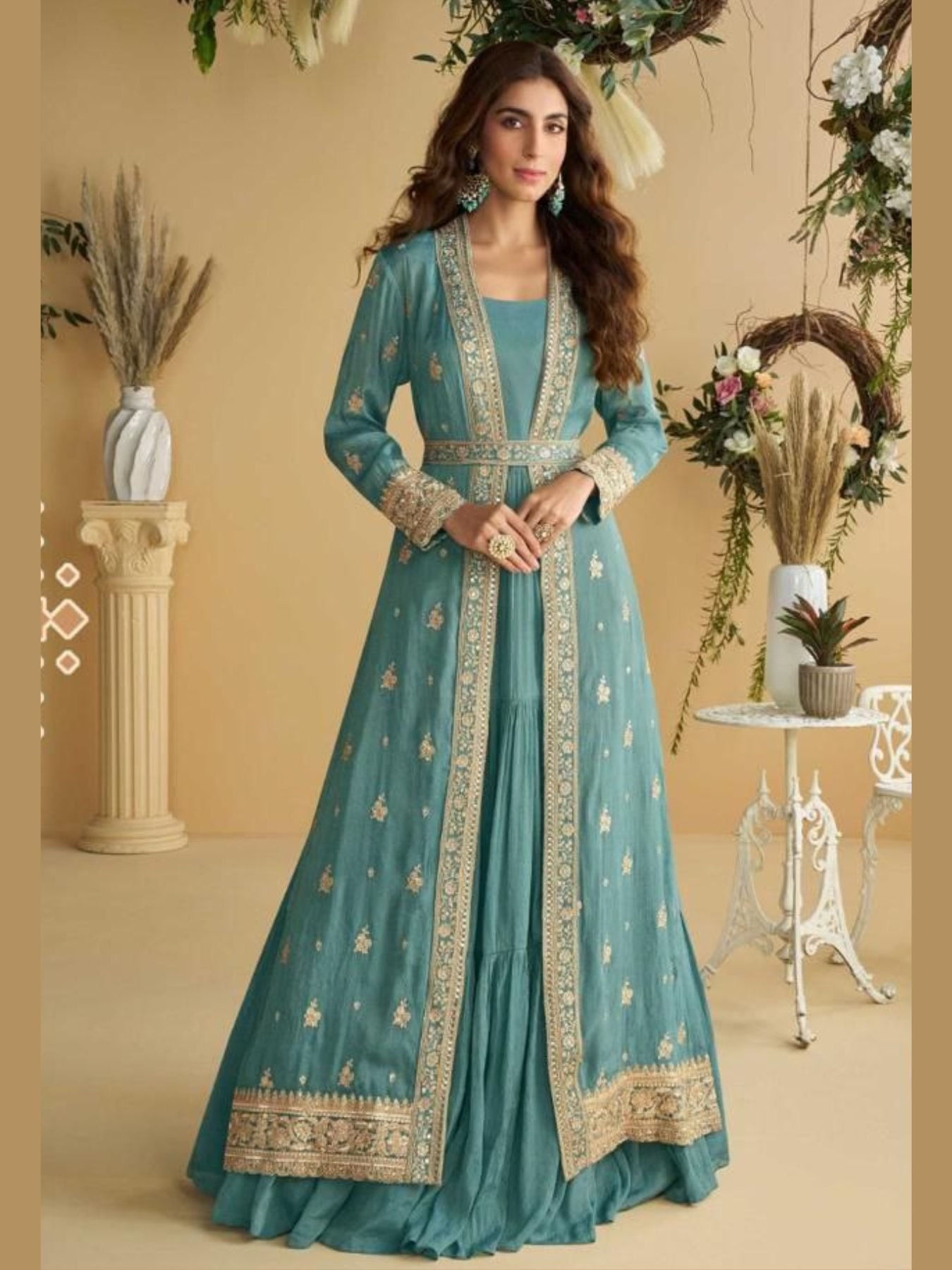 Introducing our latest Tulip style 3-piece designer set crafted in real premium Chinon silk for a luxurious fall and graceful silhouette. The beautifully embroidered shrug with front and back detailing adds a high-fashion layered look, complemented by a matching belt for a perfect fit. This ready-to-wear designer ensemble is ideal for festive occasions, parties, weddings, and premium boutique collections. Perfect choice for resellers and exporters seeking trending styles.