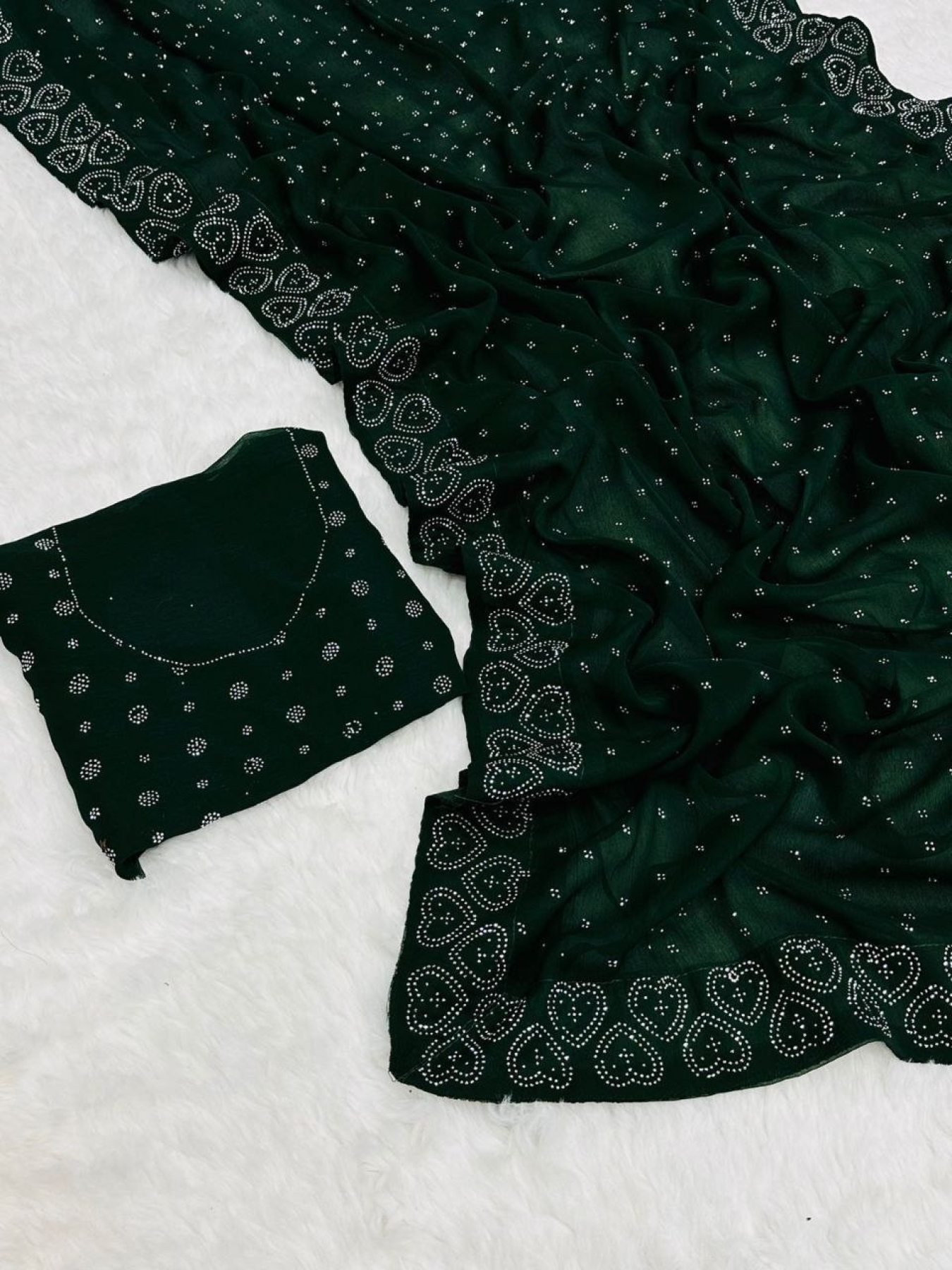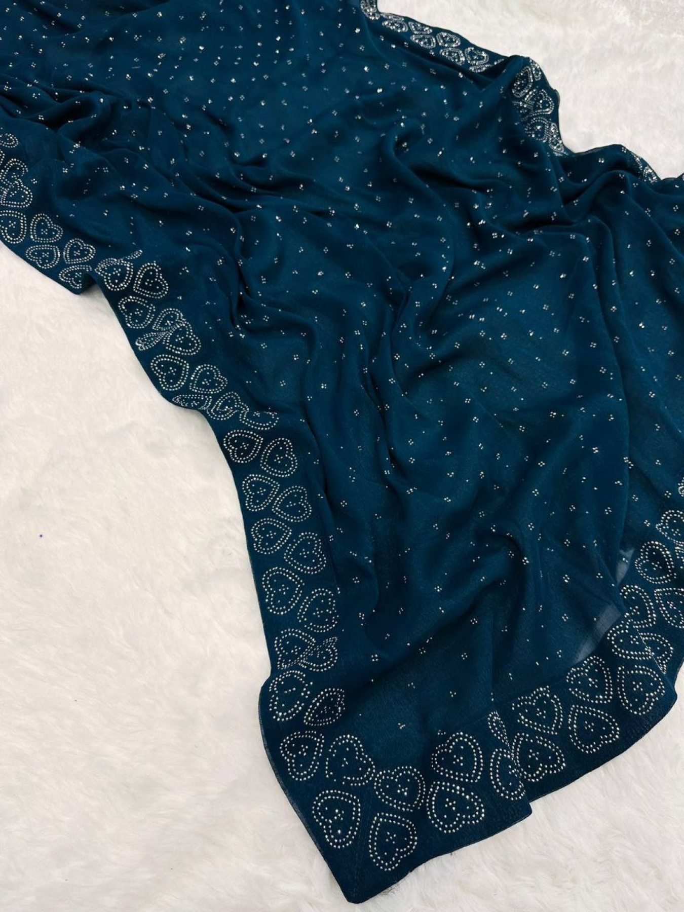 Presenting a luxurious saree crafted from fancy two-tone shining Jimichu and Gold Crush fabric, enhanced with exquisite diamond zarkan and fancy lace border work.