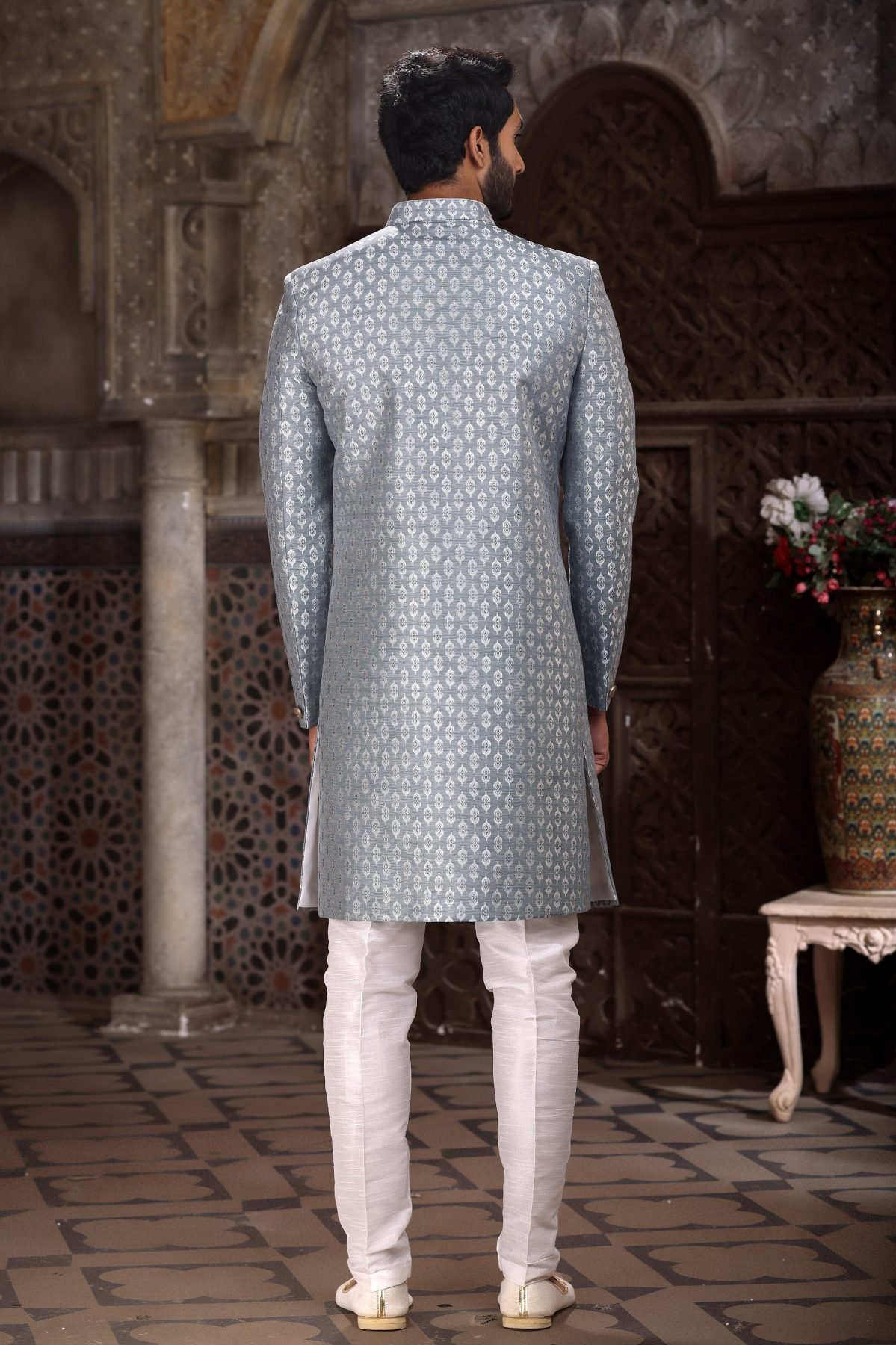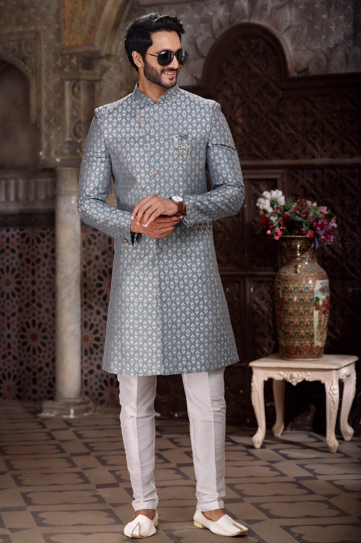 Unbeatable Grey Silk Jacquard Indo-Western Sherwani for Groom And Groomsmen
