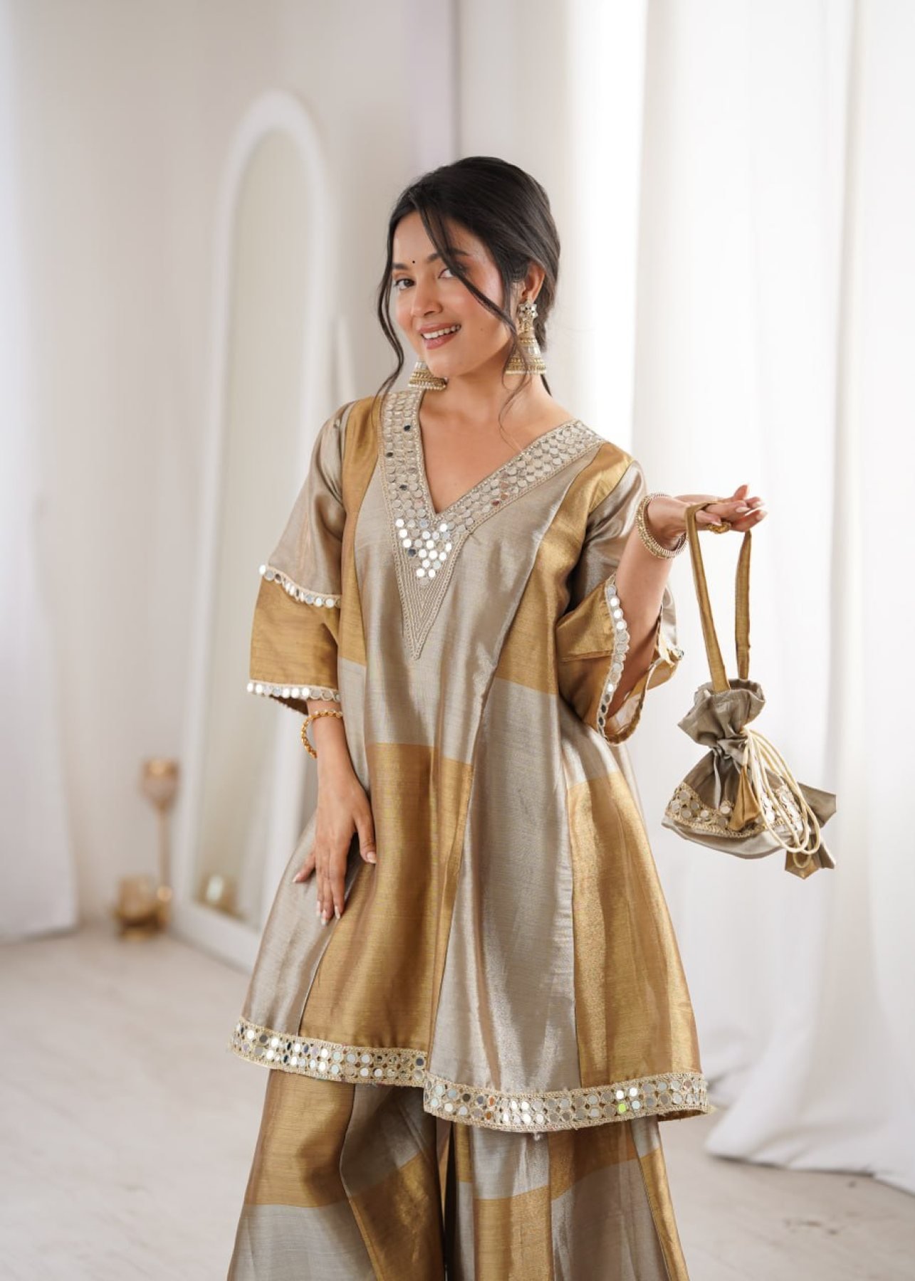 Premium two-tone tissue suit set featuring elegant coding embroidery with mirror work lace, stylish bell sleeves, and matching batwa bag. Perfect for festive, wedding, and party wear with a royal ethnic look.