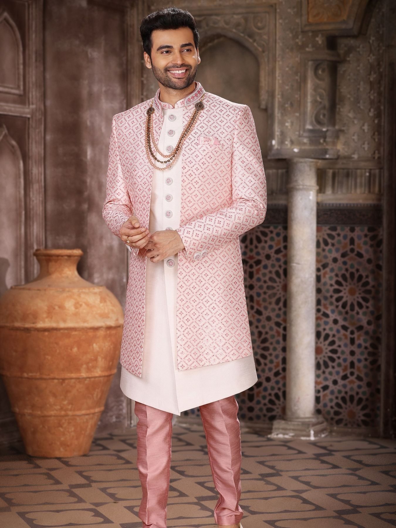 Unique Pink 3 Piece Indo Western Set in Art Silk for Groom Wear