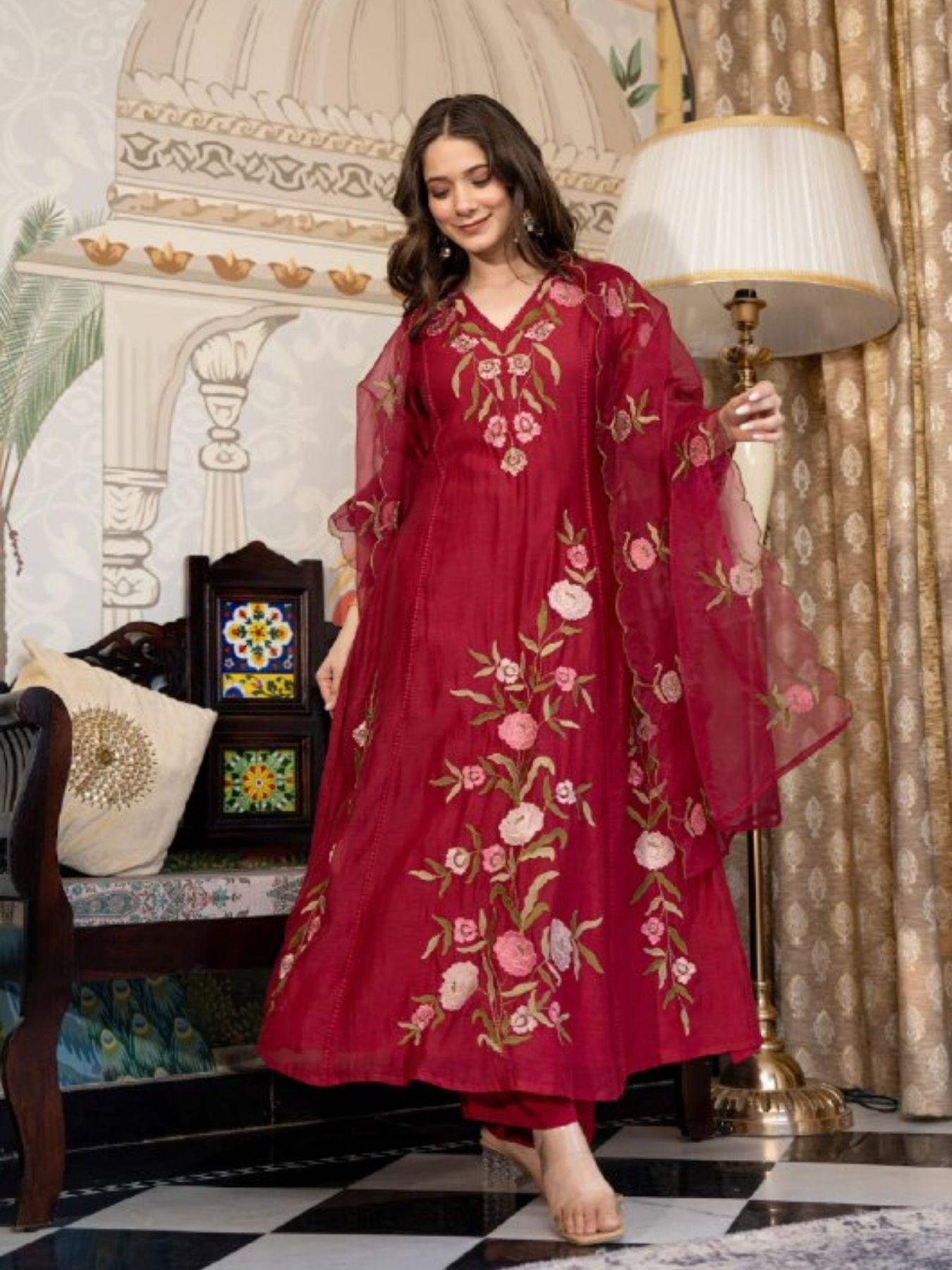 Unmatched Burgundy Color Muslin Embroidered Kurta Set with Dupatta