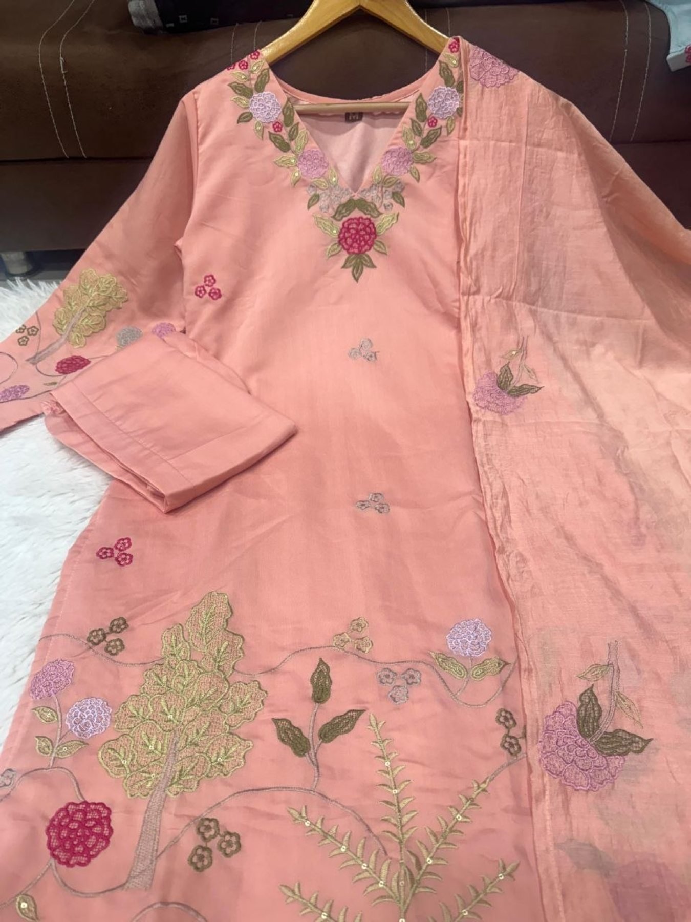 Elegant chanderi silk suit set designed with beautiful embroidery work, paired with matching pant and dupatta. Perfect for festive occasions and traditional wear.