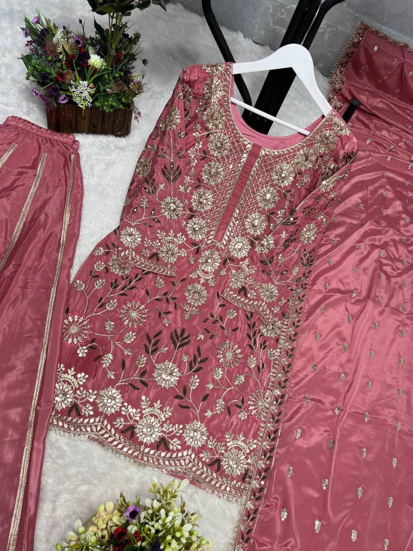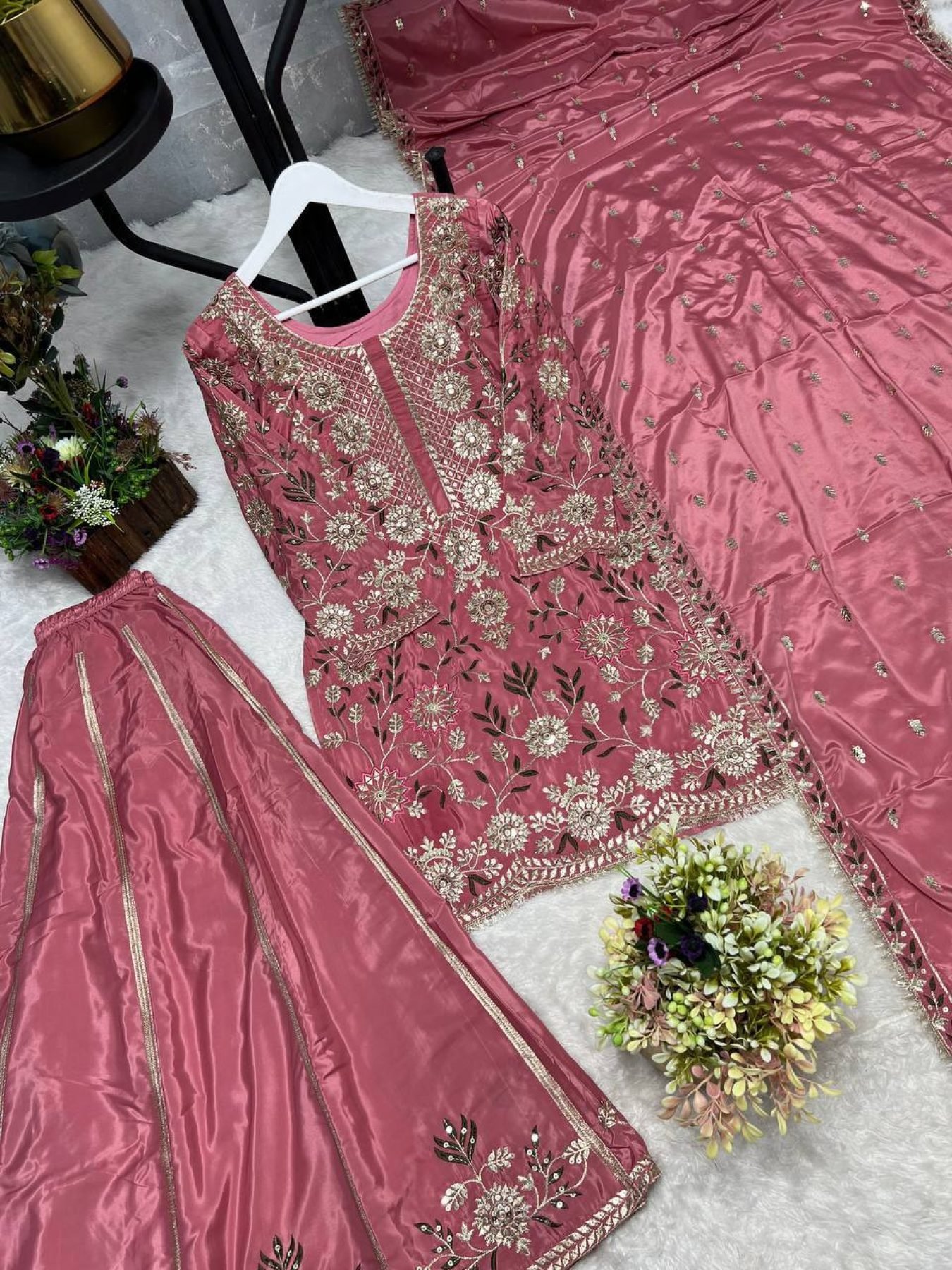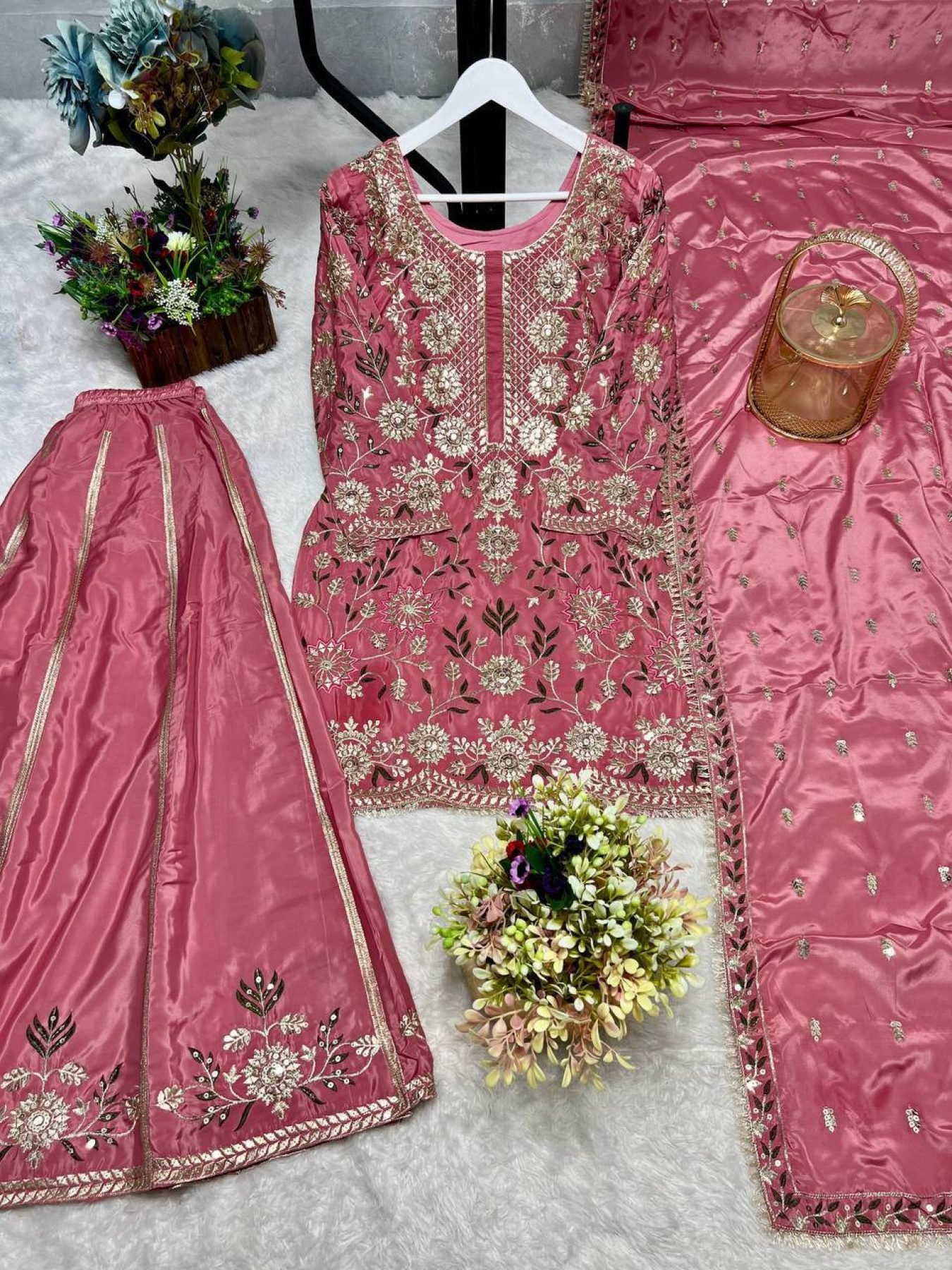 Upscale Pink Crepe Silk Embroidered Kurti Palazzo Set with Dupatta for Women