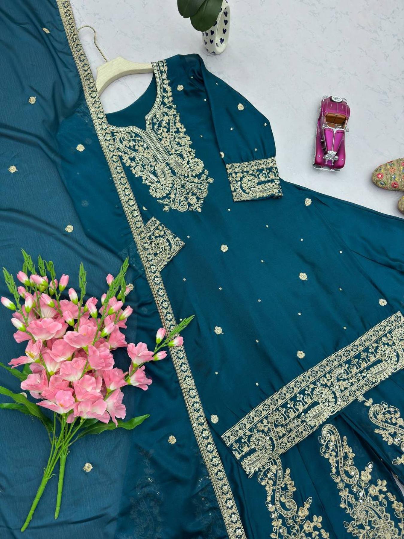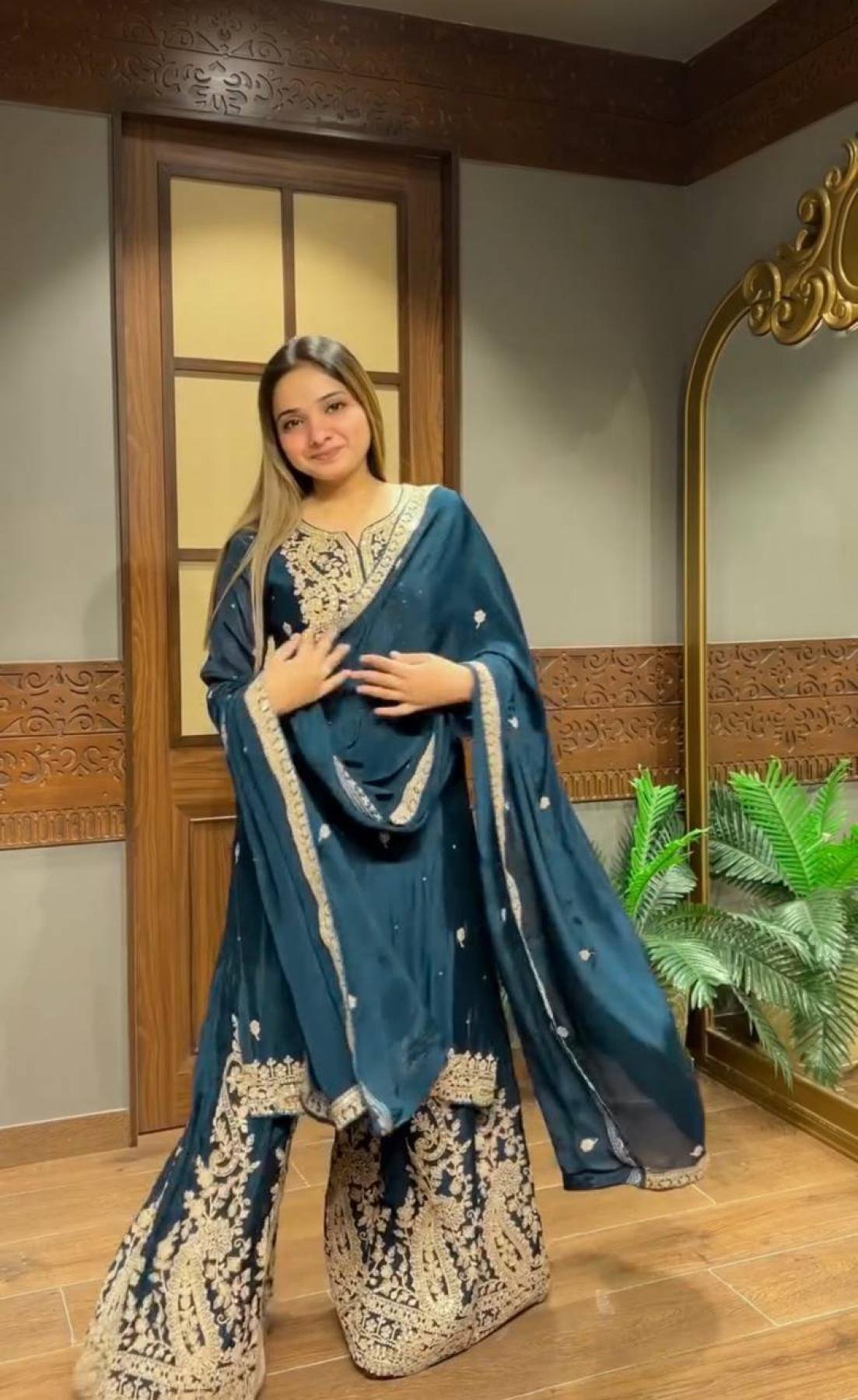 Step into luxury with this exclusive Designer Party Wear Set made from Heavy Chinon Silk, designed to dazzle at any celebration. The outfit showcases embroidery codding and sequins work across the top, plazo, and dupatta — giving it a stunning festive look. Fully stitched and ready to wear, this set combines elegance, comfort, and exquisite craftsmanship, making it perfect for parties, receptions, and festive gatherings.