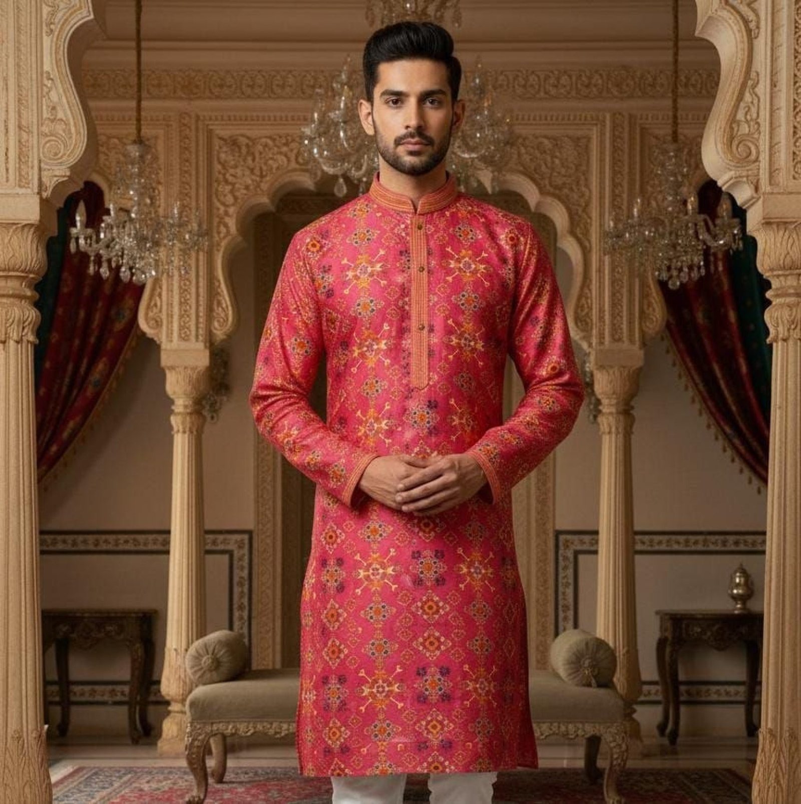 Versatile Hot Pink Stylish Mens Kurta with Printed Pintex Design for Functions