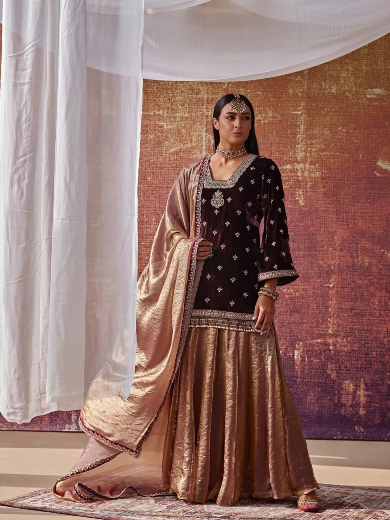 Vibrant Brown Velvet Top & Fandy Silk Lehenga Palazzo with Dupatta for Party Wear