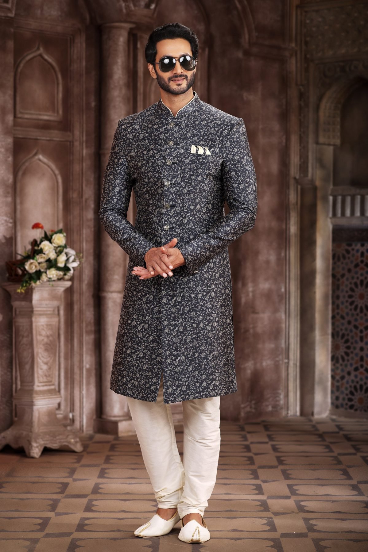 Vibrant Grey-Black Digital Printed Sherwani for Weddings And Formal Events