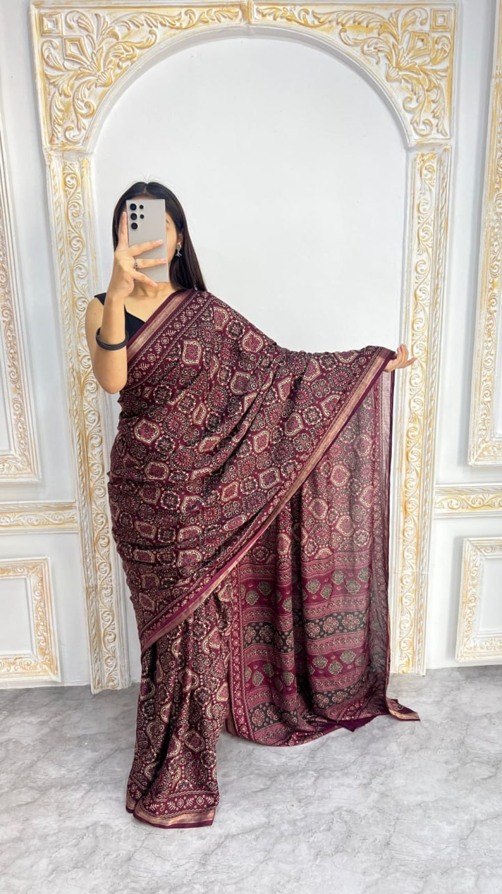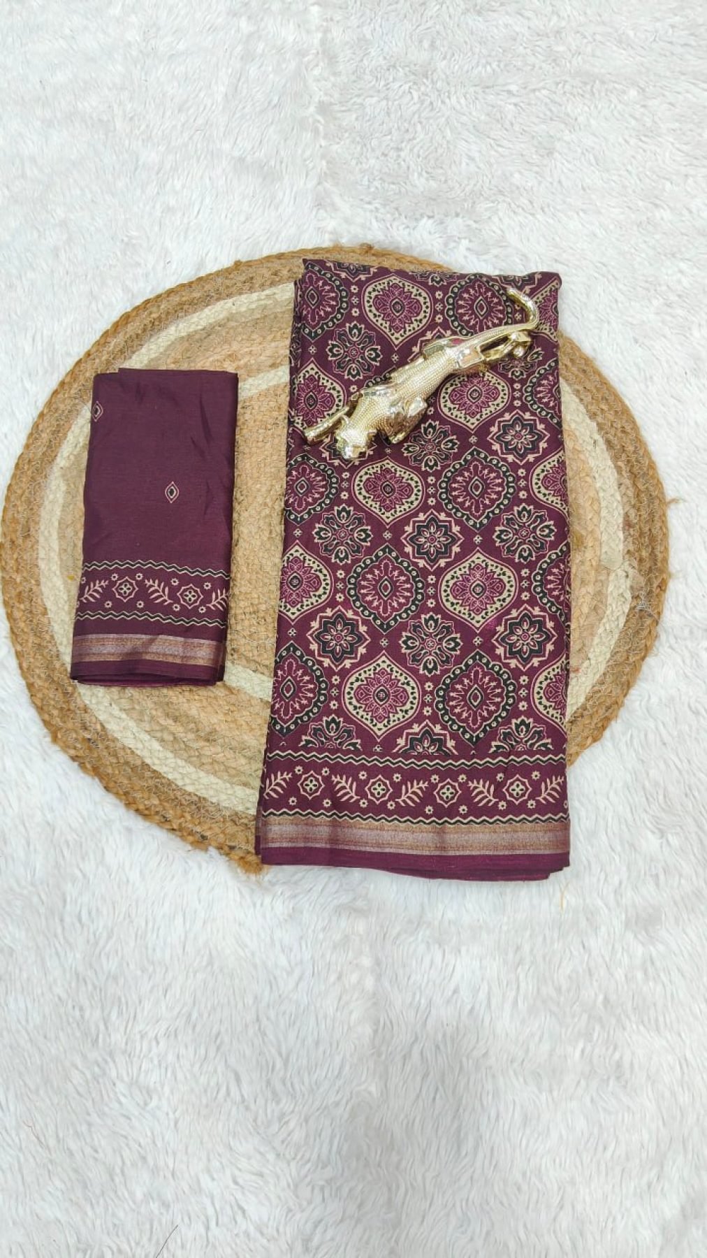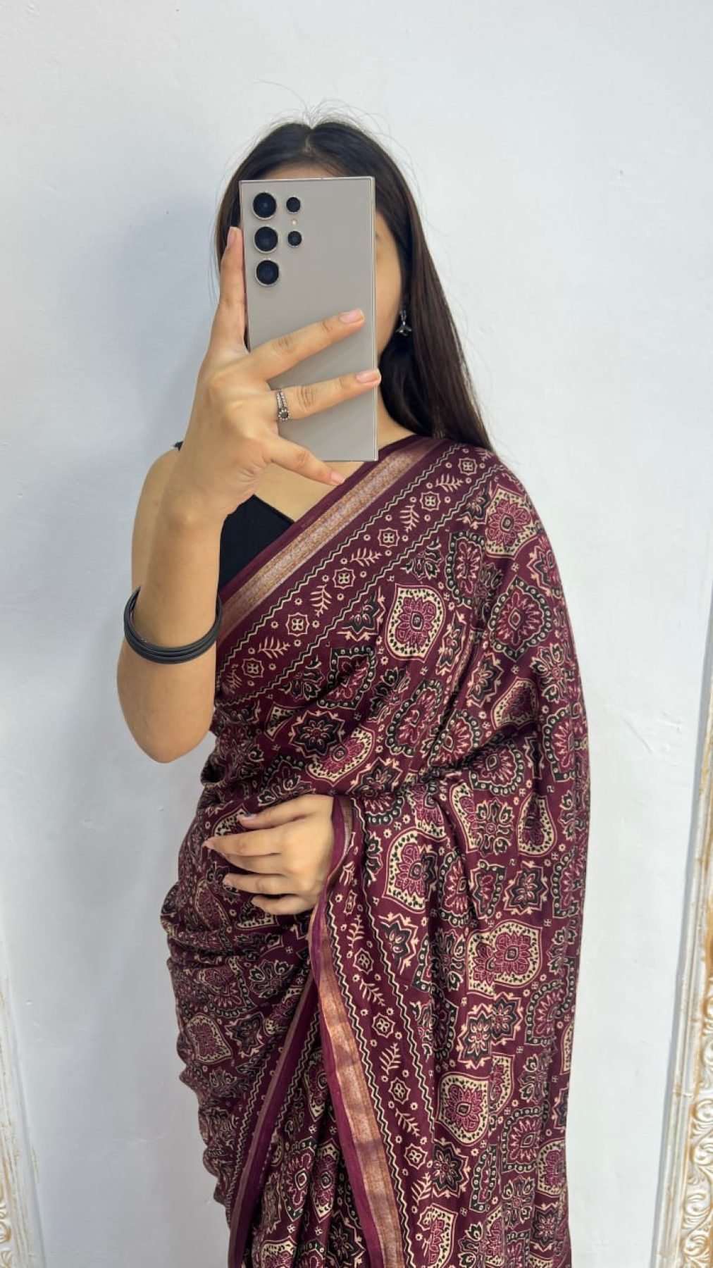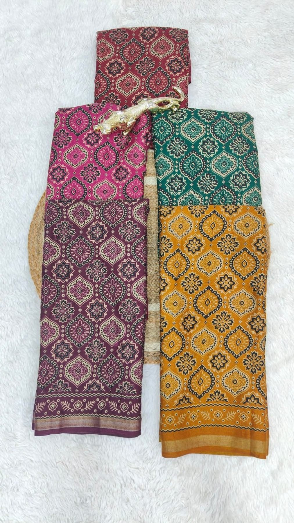 mal cotton saree featuring traditional all-over print with a stylish contrast border. Lightweight and comfortable, perfect for daily wear and casual ethnic styling.