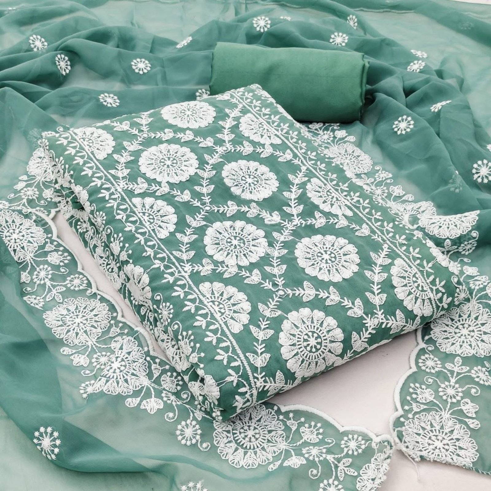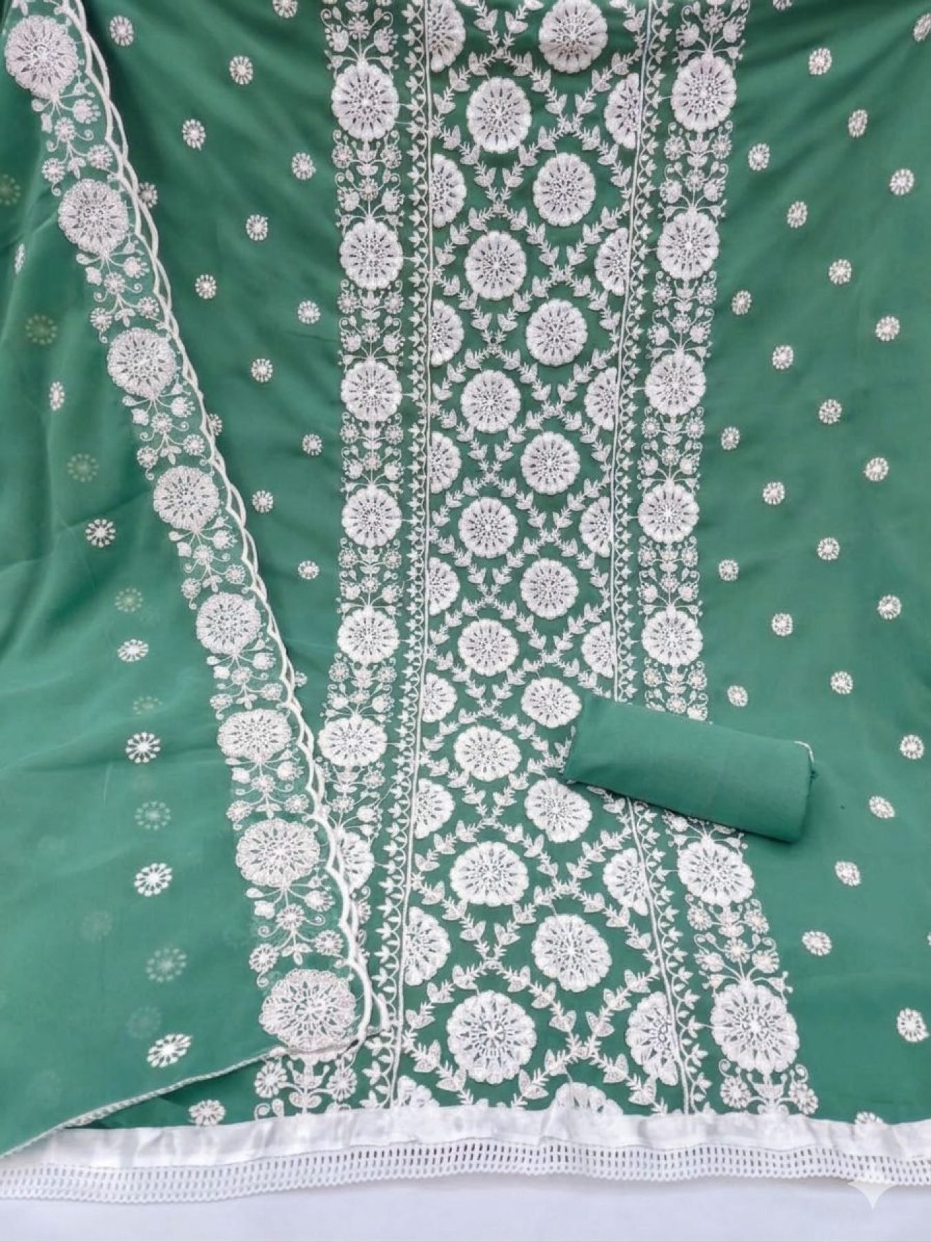Affordable georgette dress material with cotton thread work top and dupatta, paired with crepe bottom. Ideal for daily and casual ethnic wear.