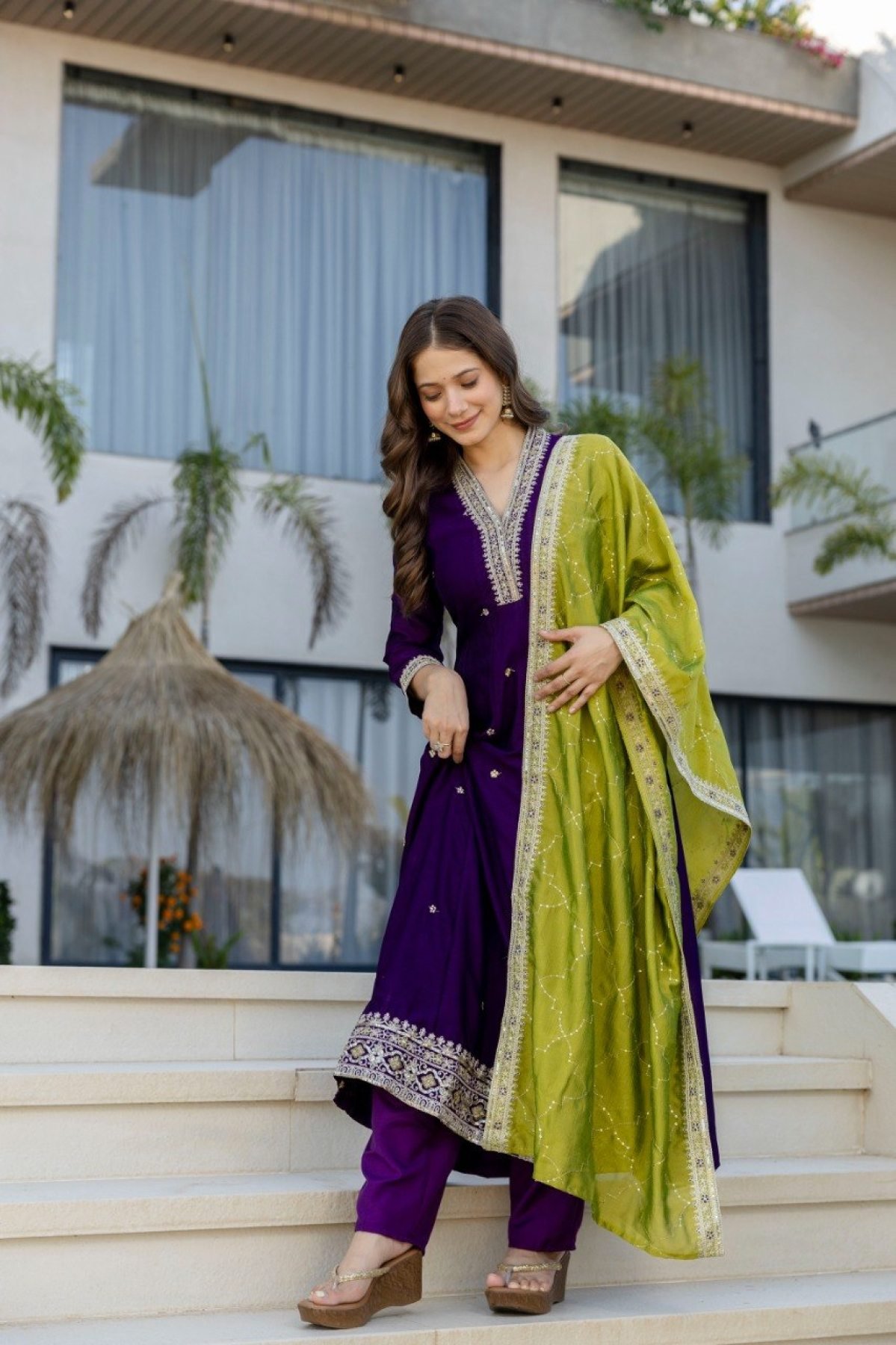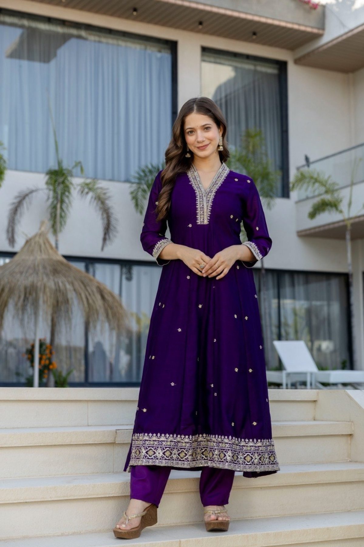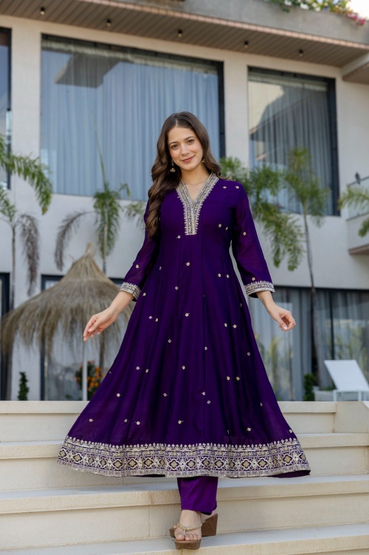 Vichitra Silk Purple Designer Anarkali Kurti Set Collection For Special Occasions