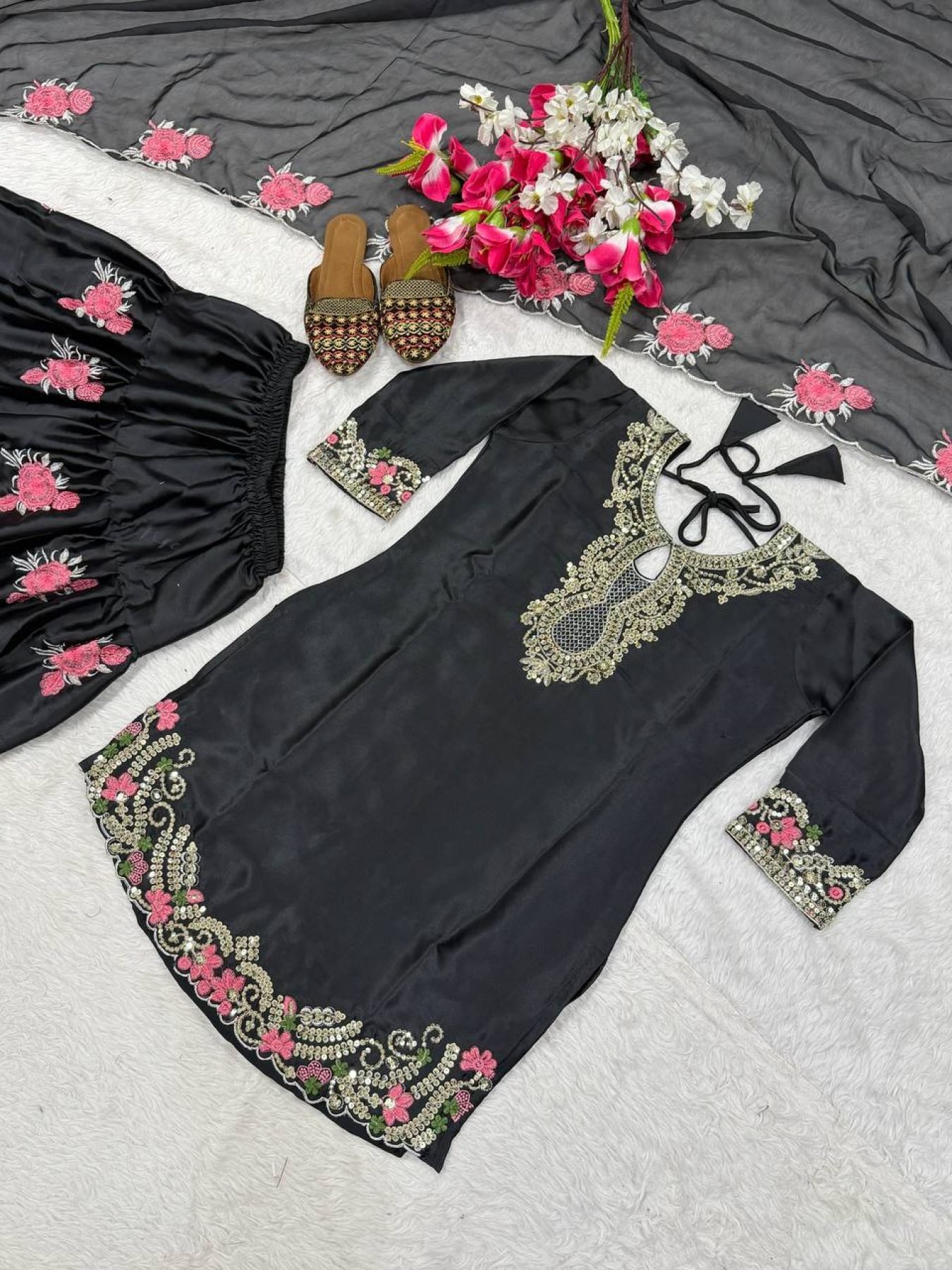 Vintage Deep Black Japan Satin Embroidered Top With Designer Farshi Salwar And Tabby Silk Embroidered Dupatta