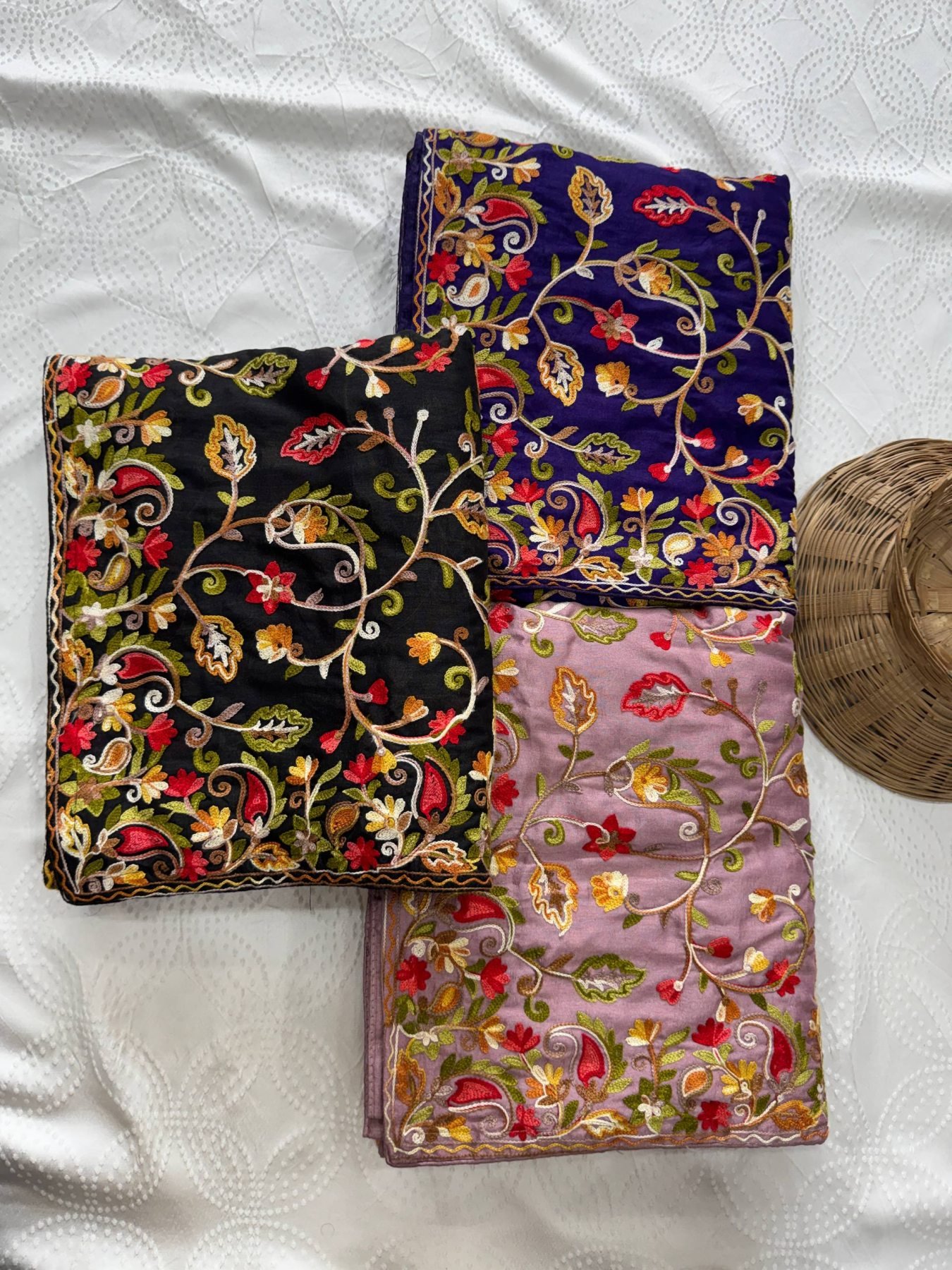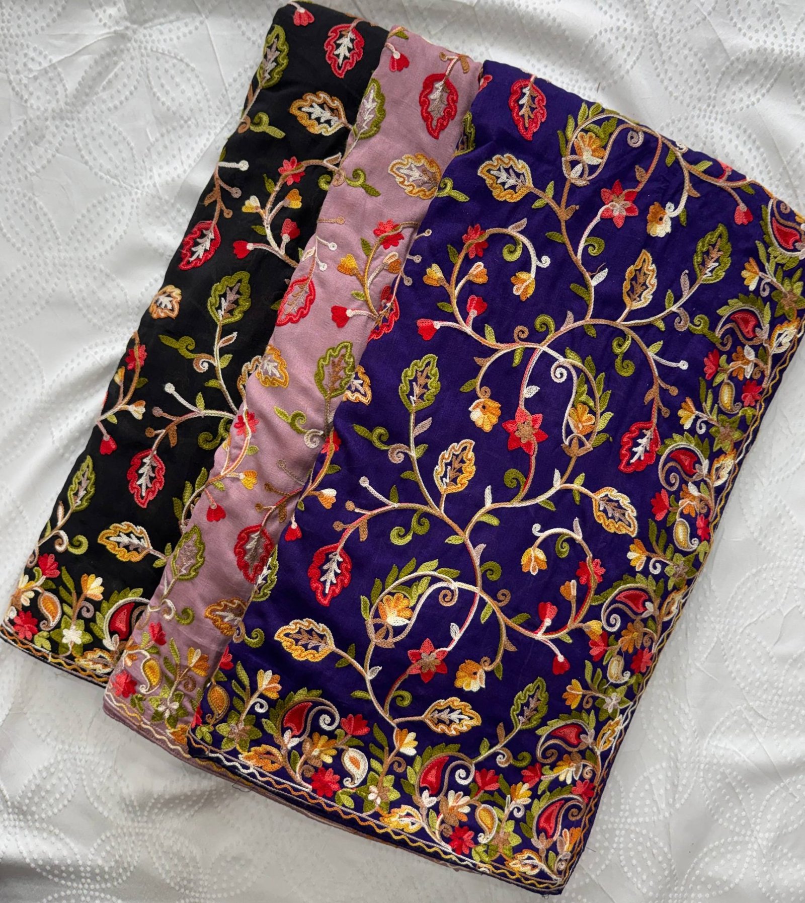 Premium soft crush silk saree featuring intricate Lakhnowi embroidery with elegant cutwork border. Paired with a matching embroidered blouse piece, perfect for weddings, parties, and festive occasions.