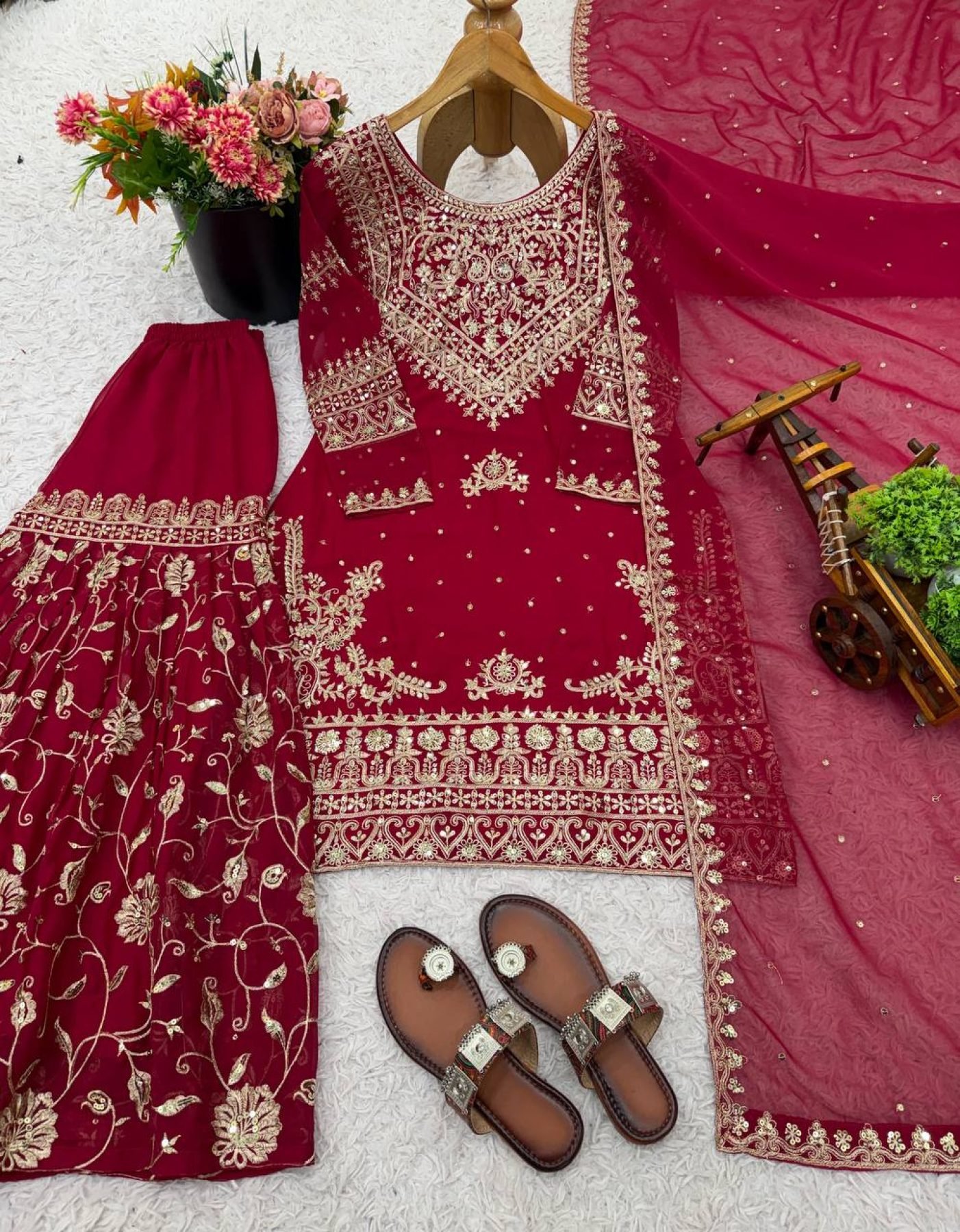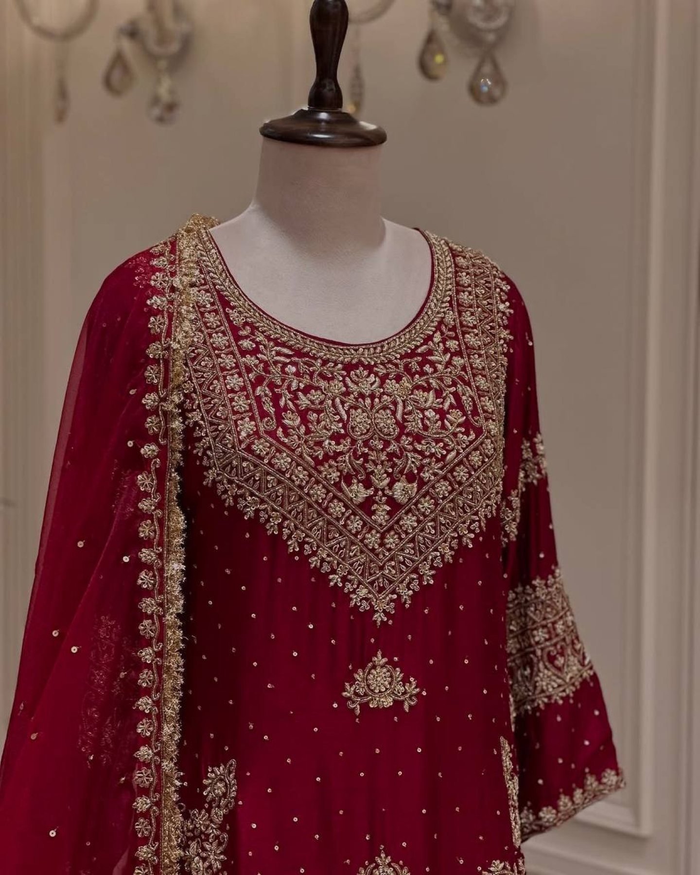 A stunning heavy georgette suit set crafted with rich sequence embroidery for a luxurious festive look. The full-sleeve top, matching bottom, and embroidered dupatta complete an elegant designer ensemble. Fully stitched quality perfect for weddings, parties, boutiques, and international wholesale buyers.