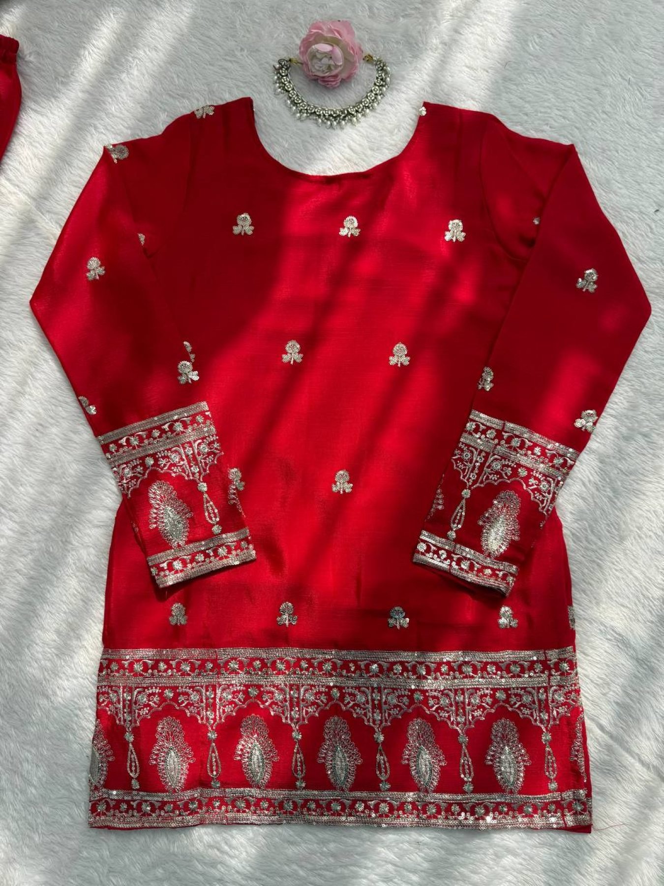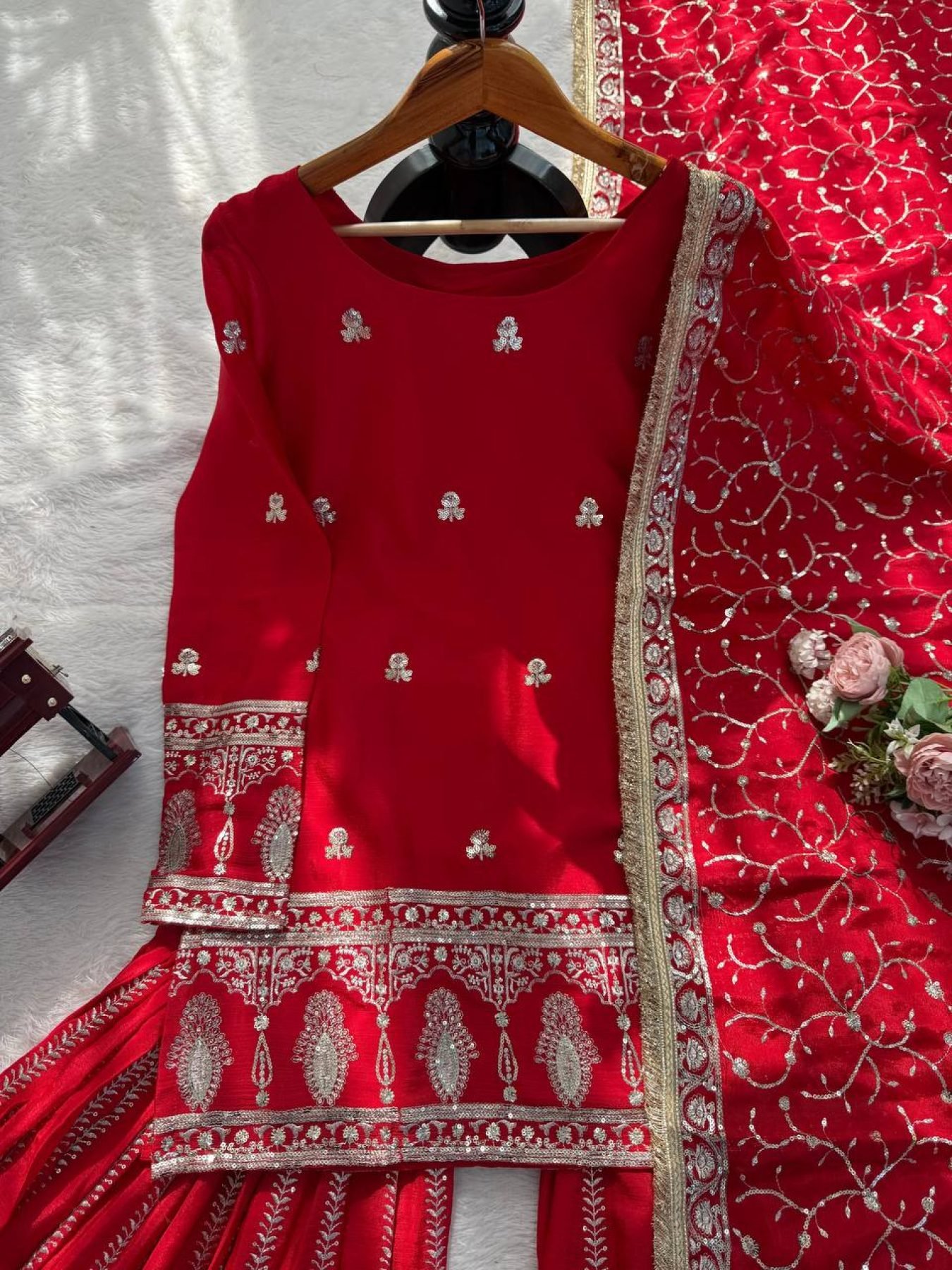 Elegant chinon silk sharara set featuring thread and sequins embroidery with matching dupatta. Perfect for party wear, festive occasions, weddings, and traditional celebrations.