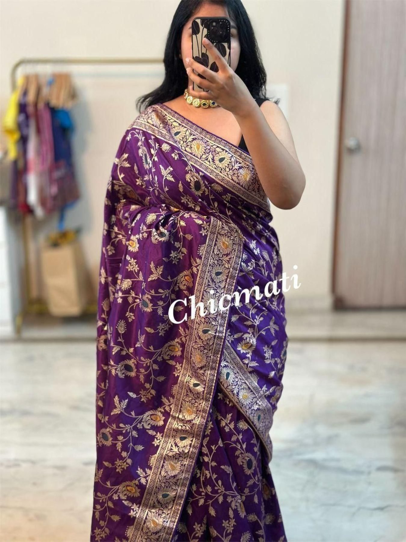 Elevate your ethnic collection with this luxurious Banarasi Silk Saree, intricately woven with mina work all over and finished with a rich traditional pallu. A timeless piece ideal for festive wear, weddings, and premium reselling.