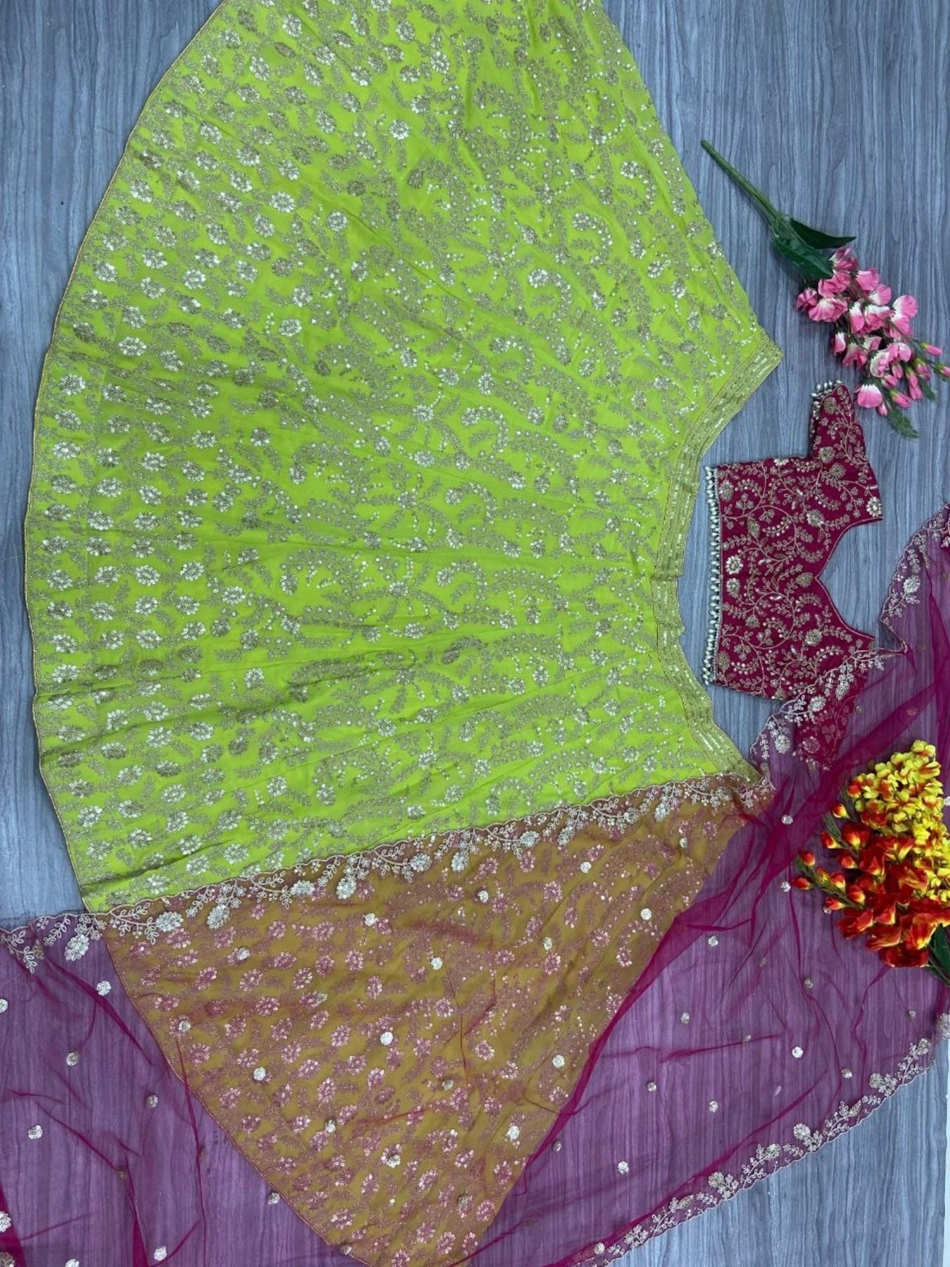 Lehenga : Premium Georgette Embellished With Beautiful Shimmer Dori Work , Heavy Sequins Work With Heavy Cancan And Canvas With Double Inner Covering With 3.5Mtr Flair*( Semi Stitched. )