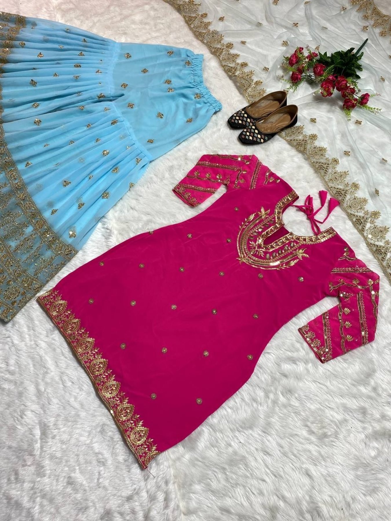 Plazzo Fabrics :Heavy Faux Georgette With 9mm Embroidery Sequence Work Fully Flair