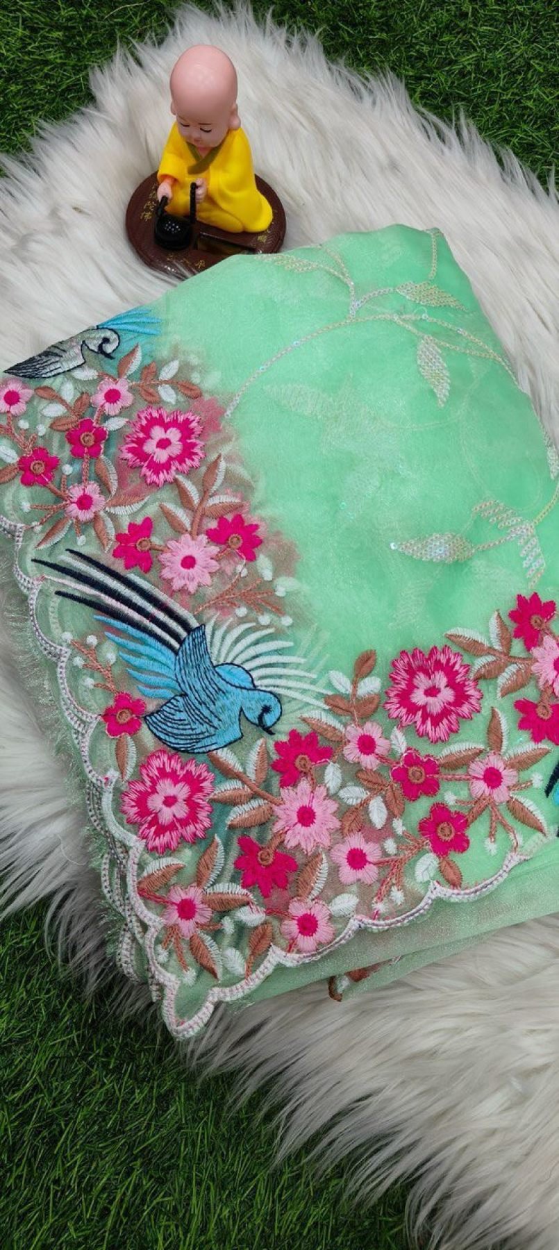 Wedding Wear Pista Organza Saree with Designer Arc Border & Sequin Embroidery Elegance