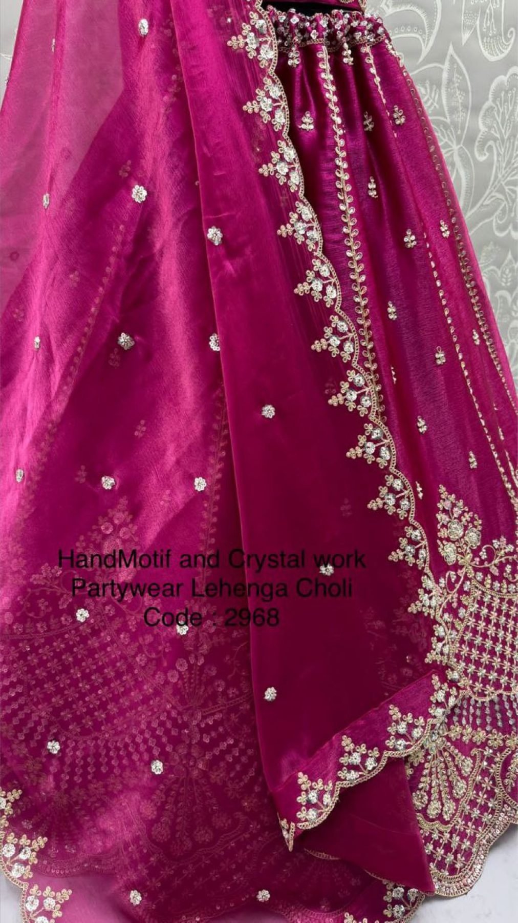 Luxury satin lehenga set with heavy handwork motif, crystal detailing, and rainbow sequins embroidery. Paired with embroidered blouse and organza dupatta, perfect for bridal and grand occasions.