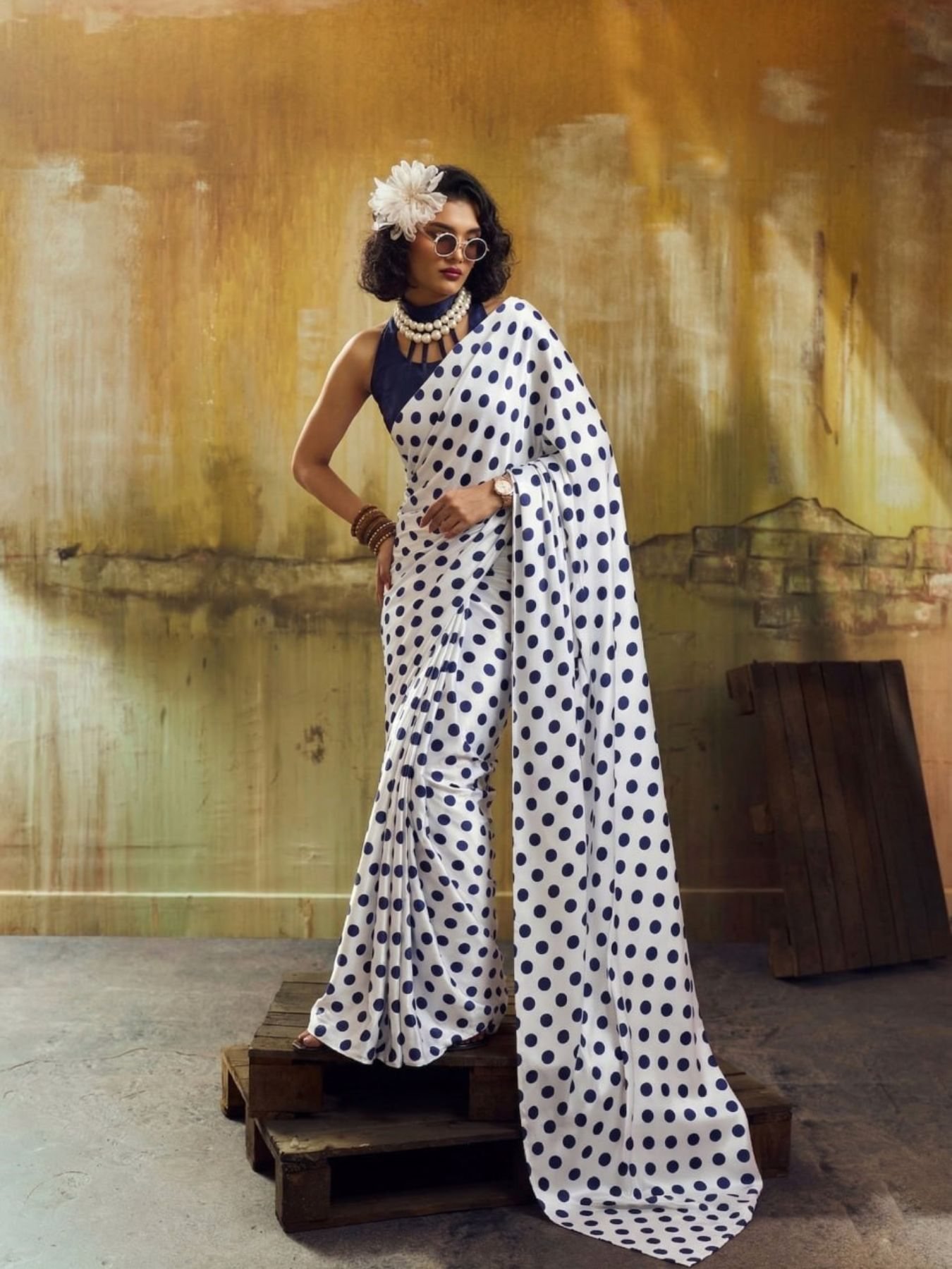White And Blue Polka Dot Printed Satin Saree Often Styled In Retro Bollywood Fashion