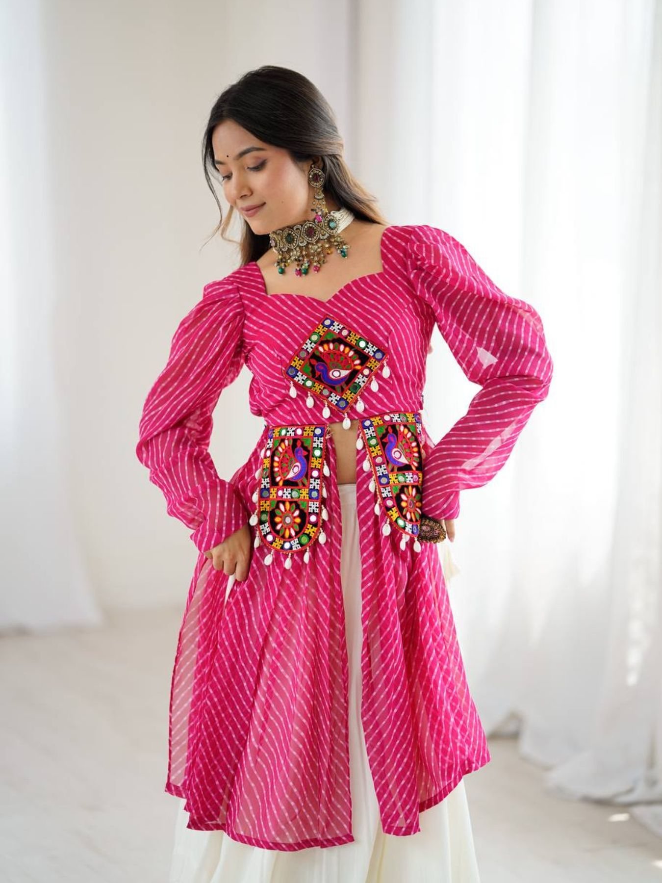 White and Pink Gamthi Jacket Lehenga Set with Cowrie Detailing Navratri Exclusive