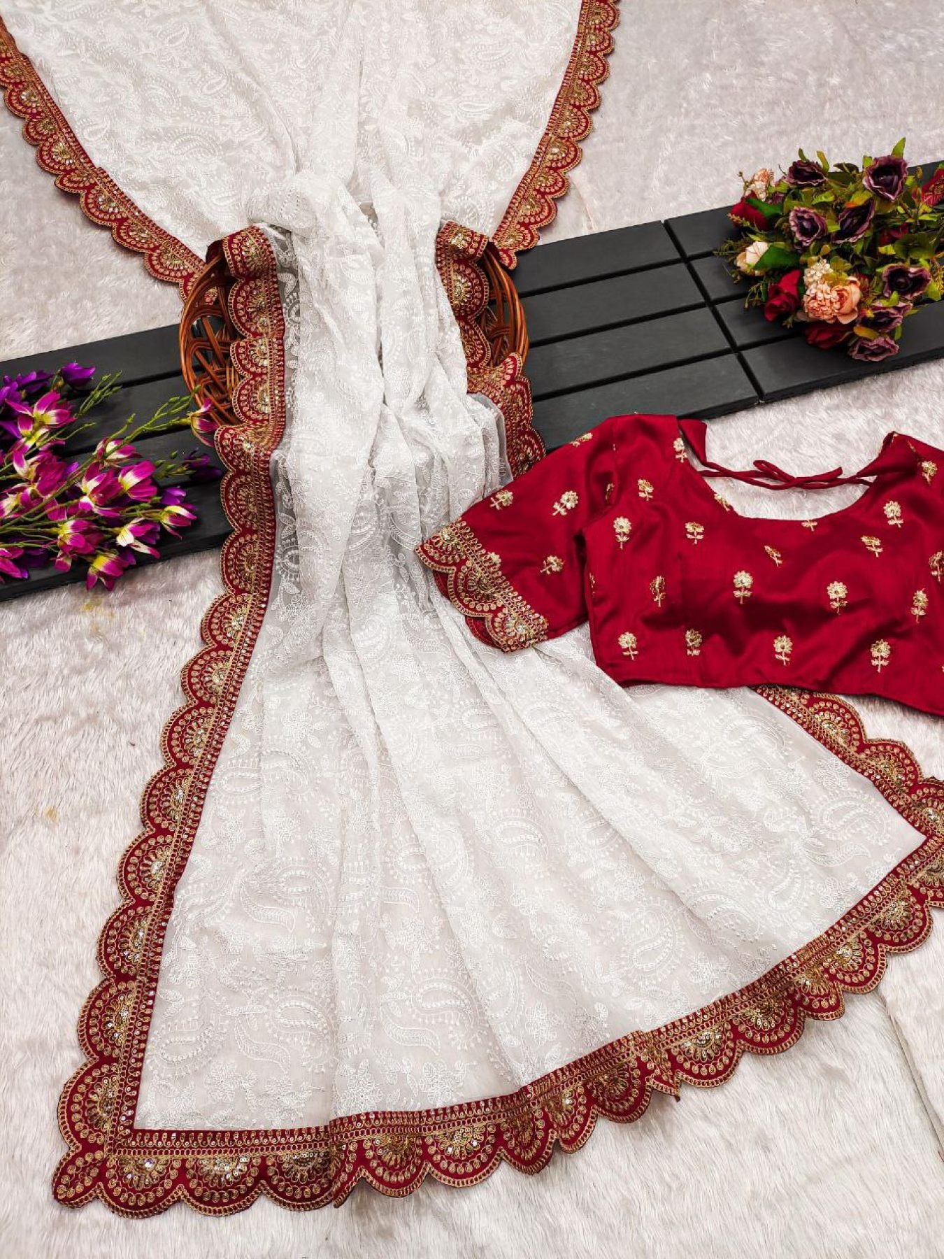 Saree Fabric & Work: Soft Georgette with All-Over Chikankari Style Jaal Embroidery & Red Border Patch (Zari + Sequins Work)