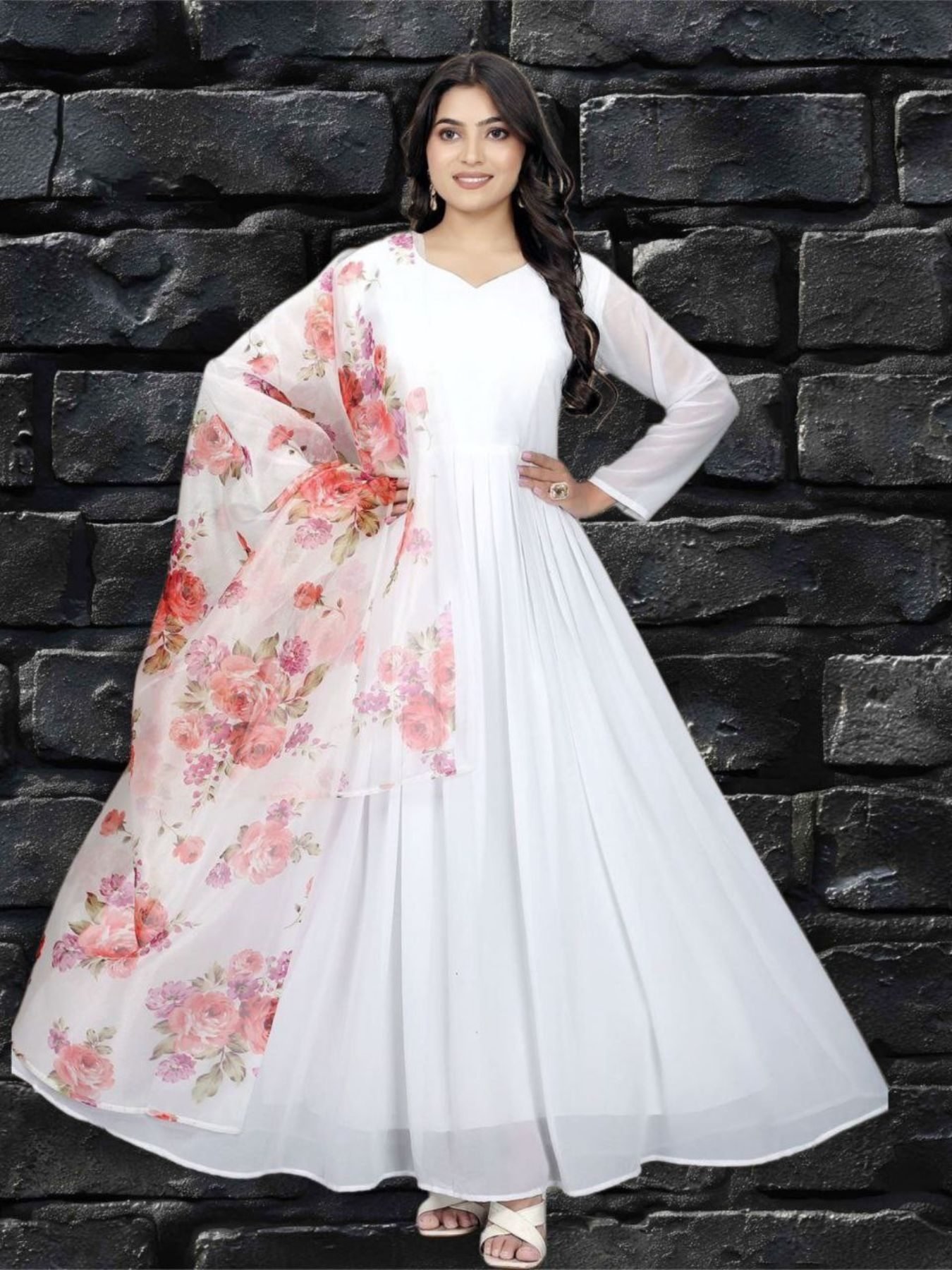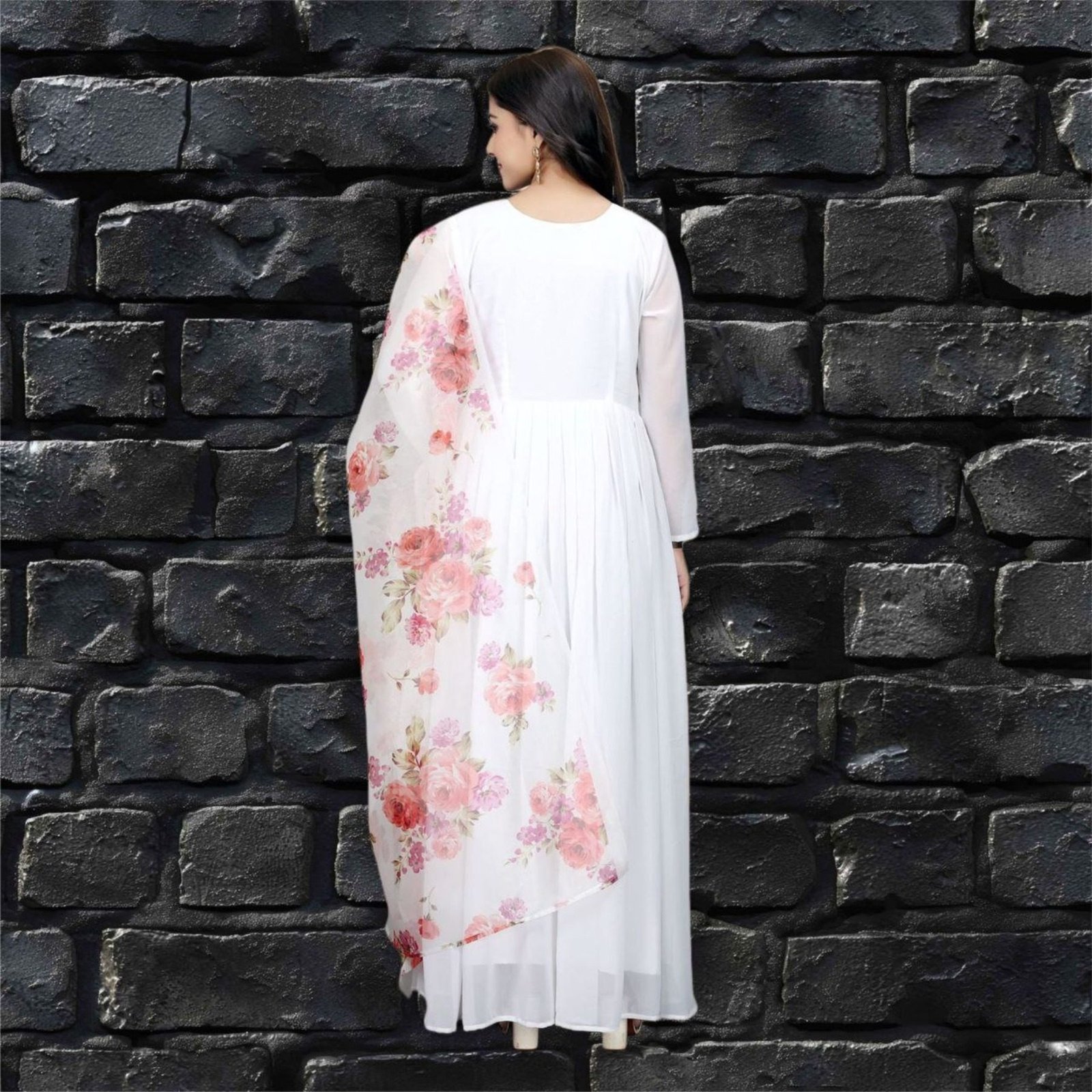 White Color Faux Georgette Anarkali Suit With Beautiful Dupatta