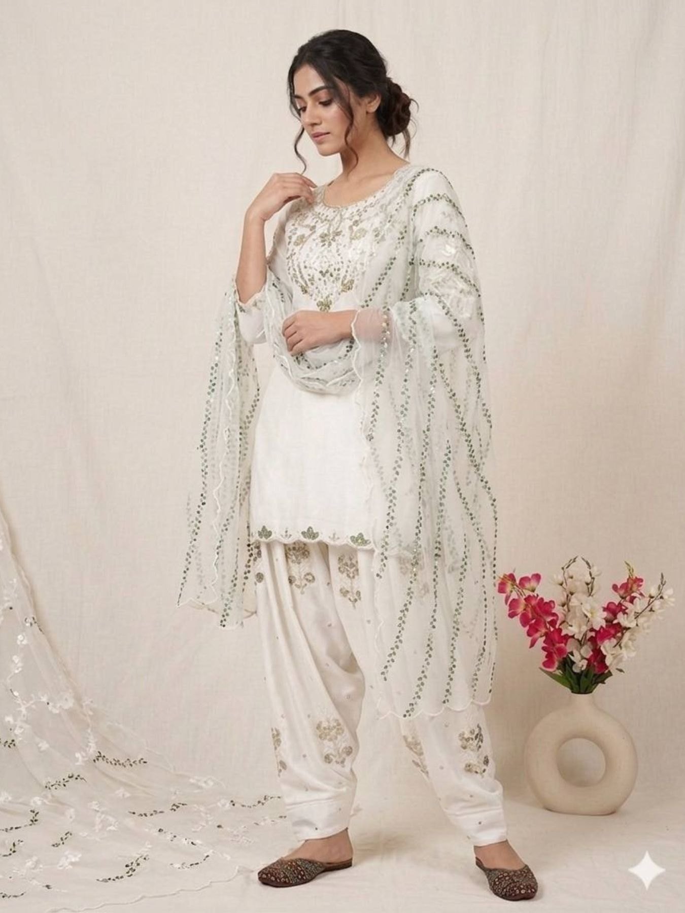 White Designer Salwar Kameez with Gota and Mirror Work Dupatta