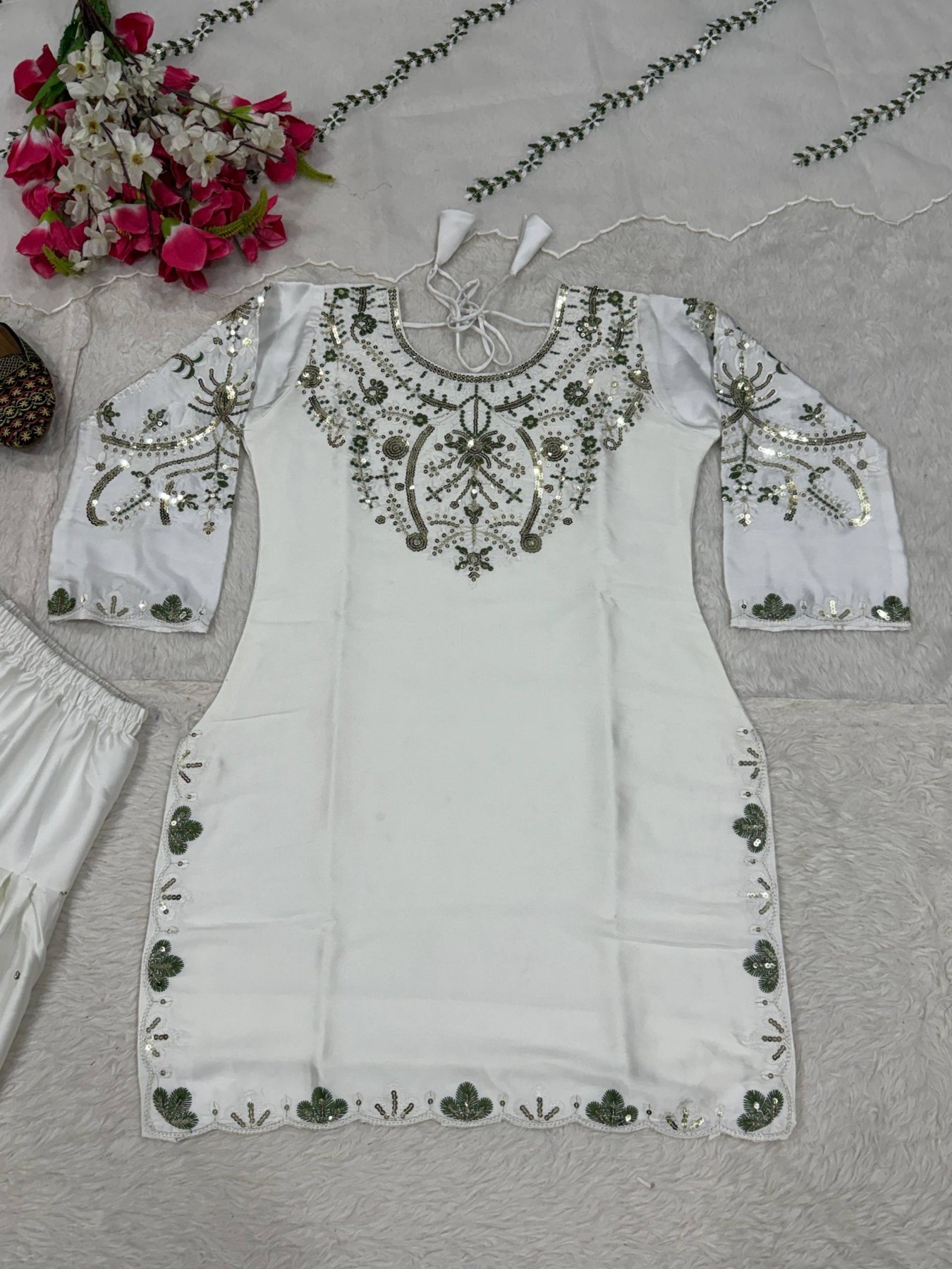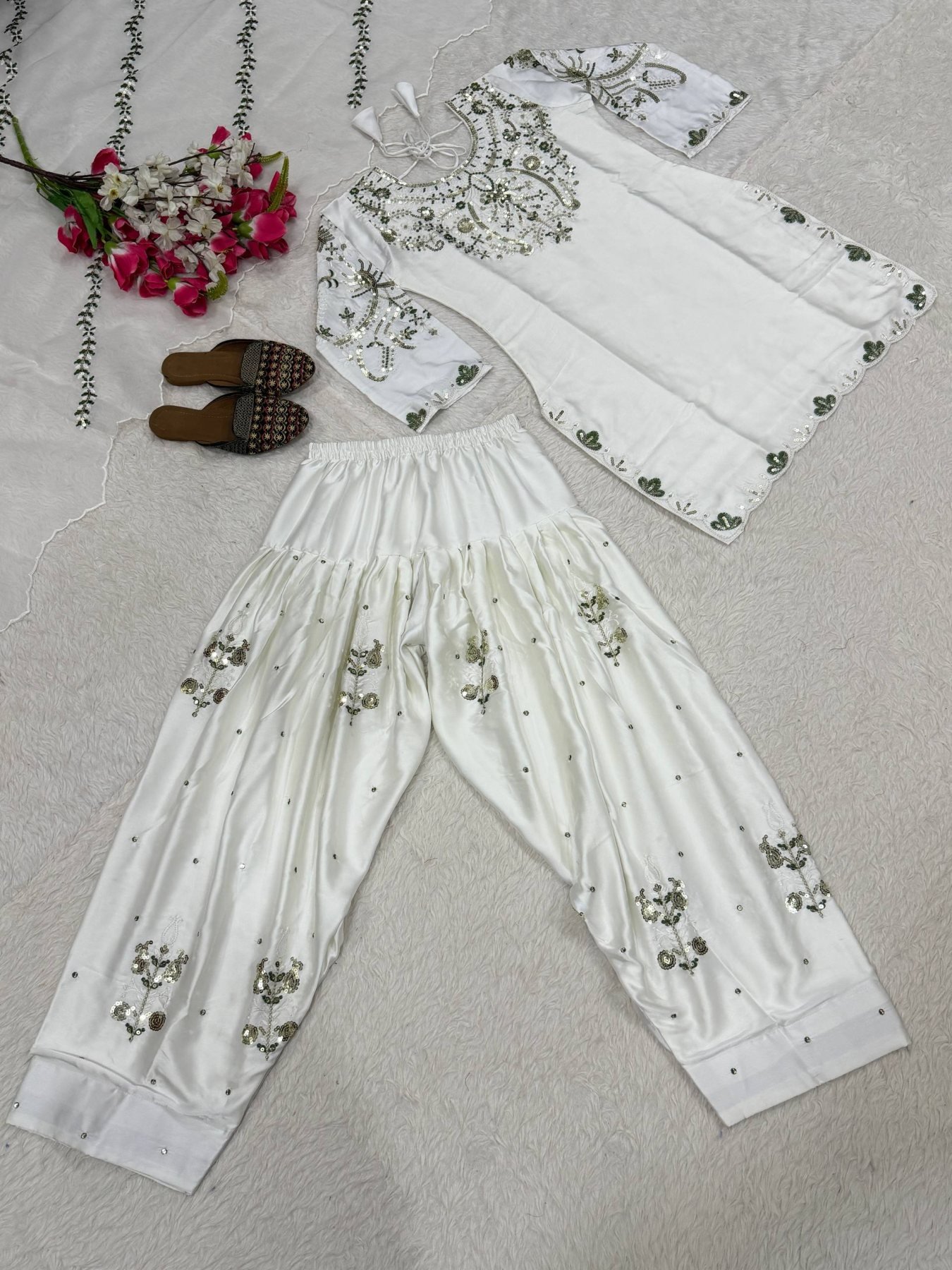Premium Japan satin suit set featuring elegant embroidery sequence work on top, paired with stylish farshi salwar and rich organza silk dupatta. A unique designer piece perfect for festive, wedding, and party wear.
