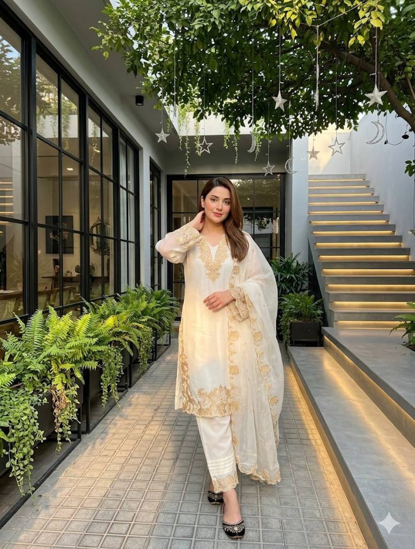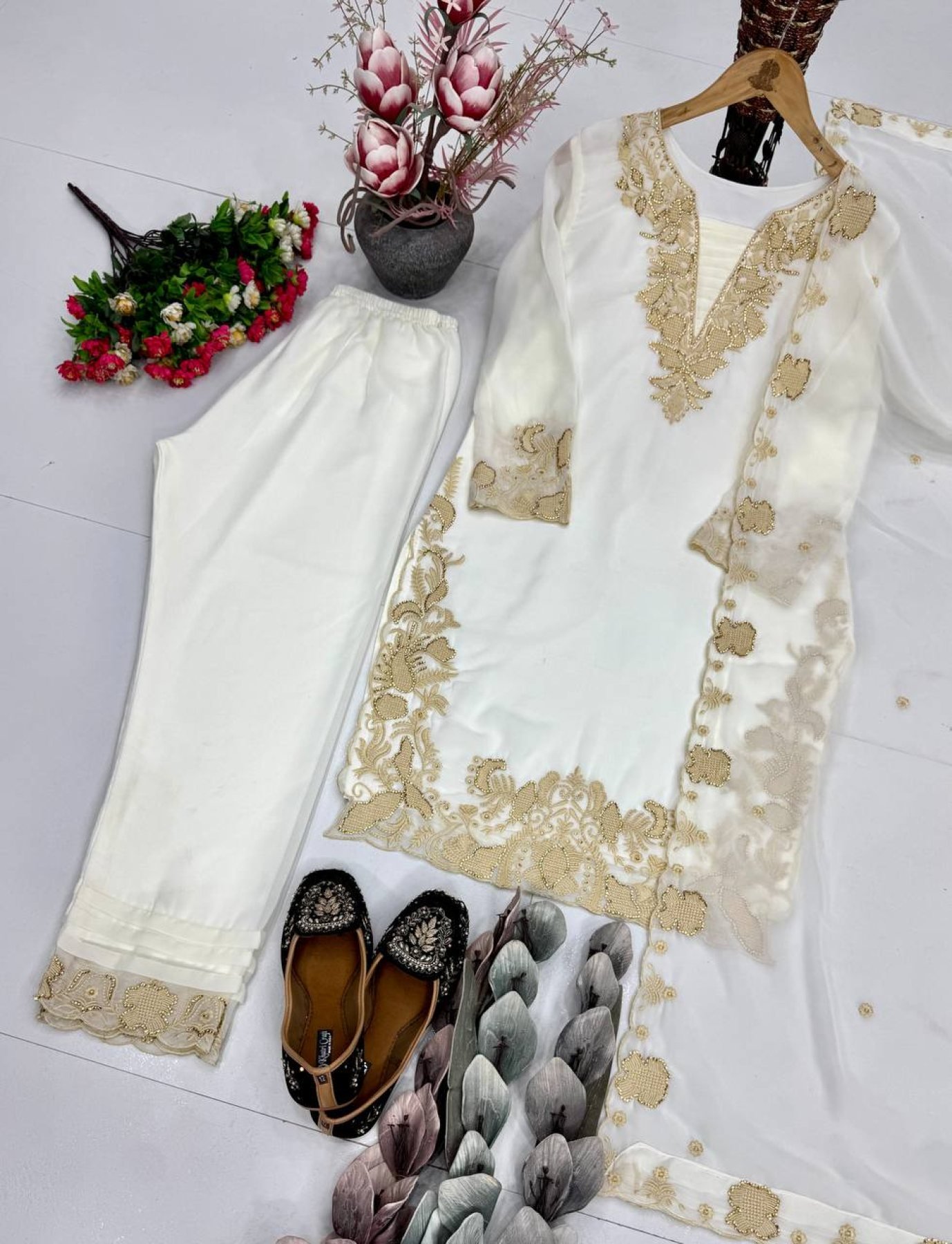 White Indian Ethnic Wear Kurta Suit Set and Dupatta With Embroidery in Georgette