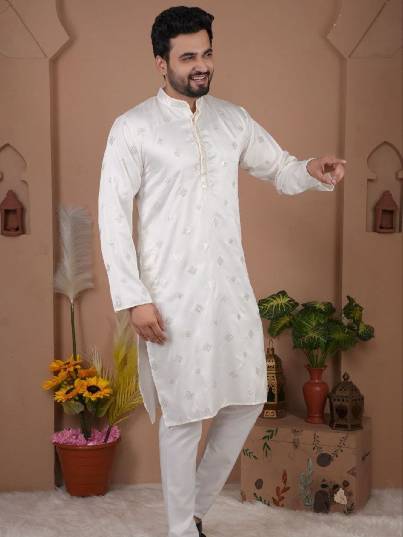 White Silk Kurta with Heavy Embroidery Work for Party Wear at Manufacturer Rate