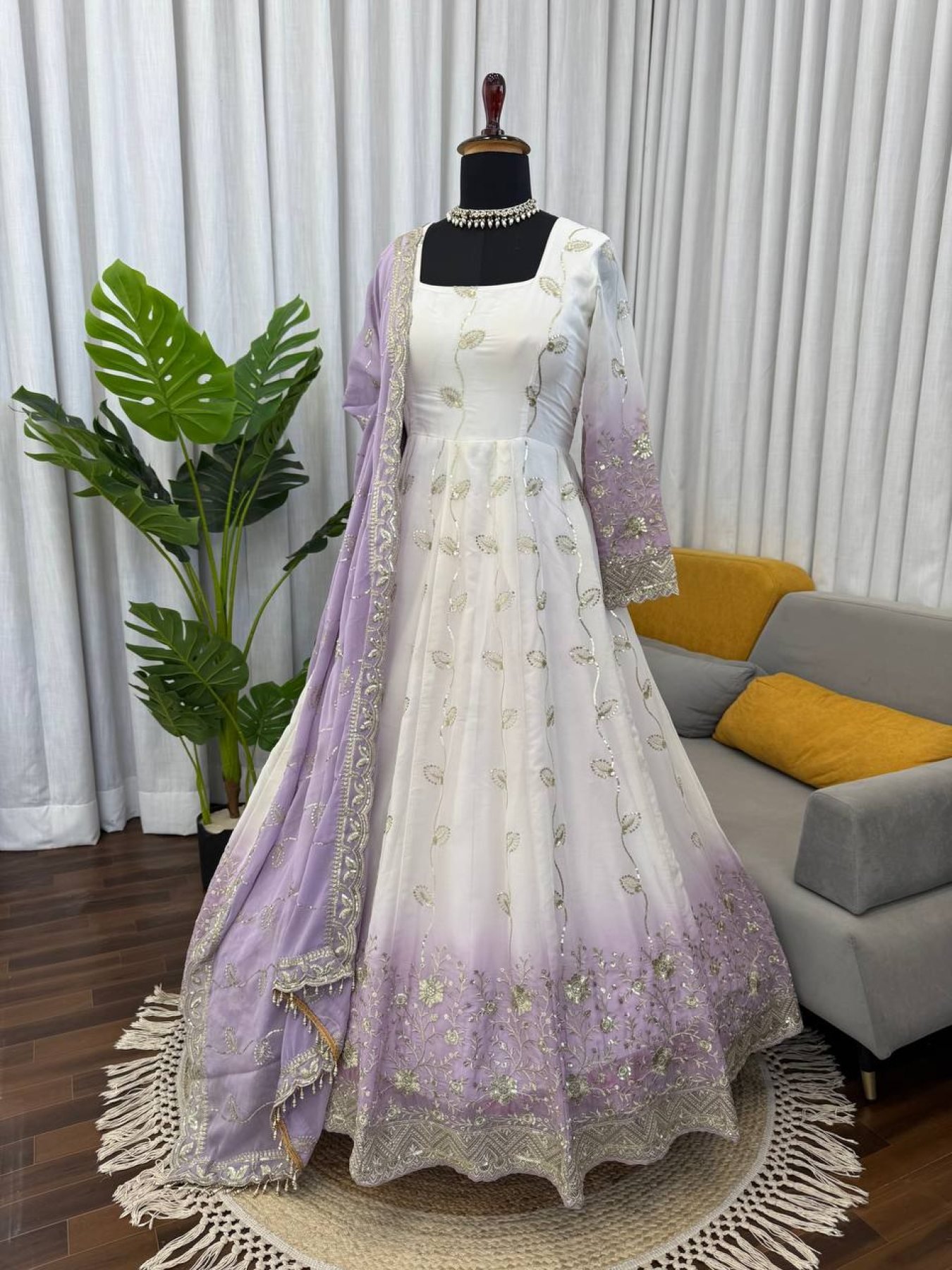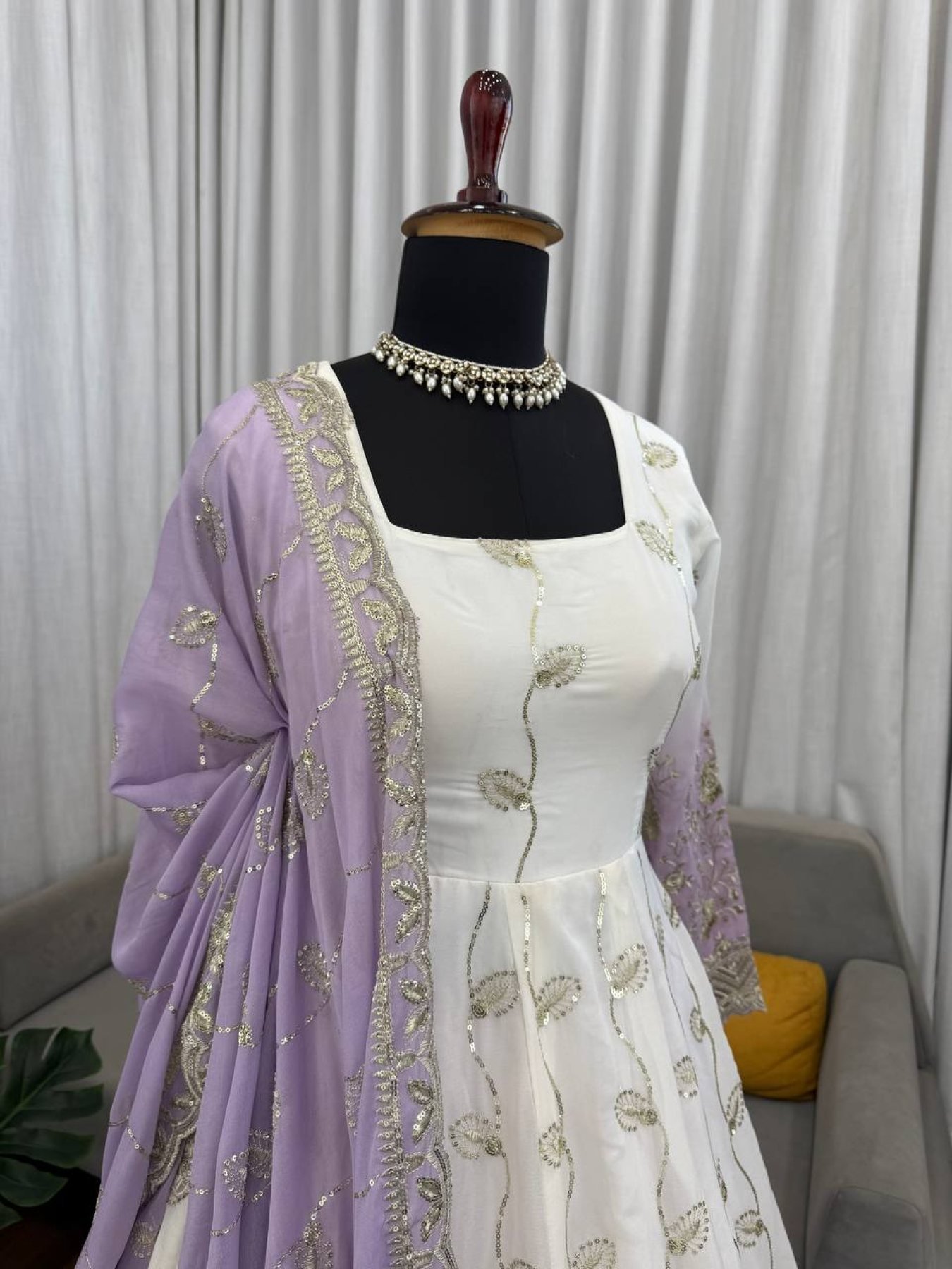 White Star Georgette Thread Sequence Anarkali Set with Pant and Dupatta Ethnic Wear for Eid and Ramadan