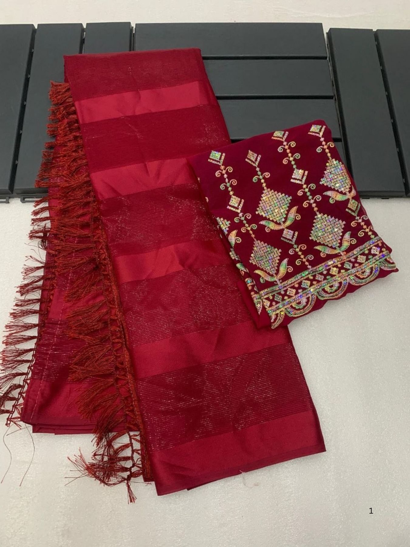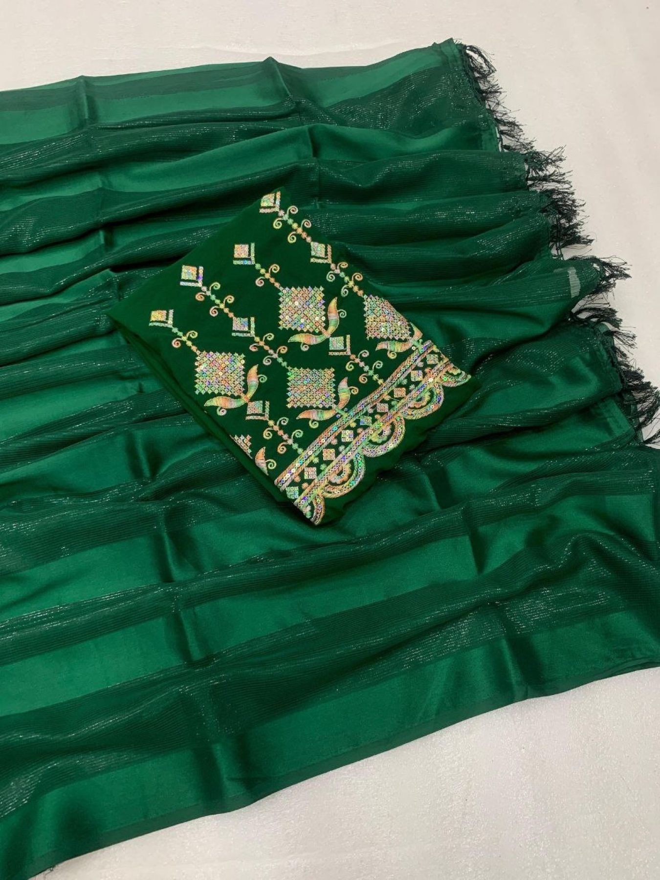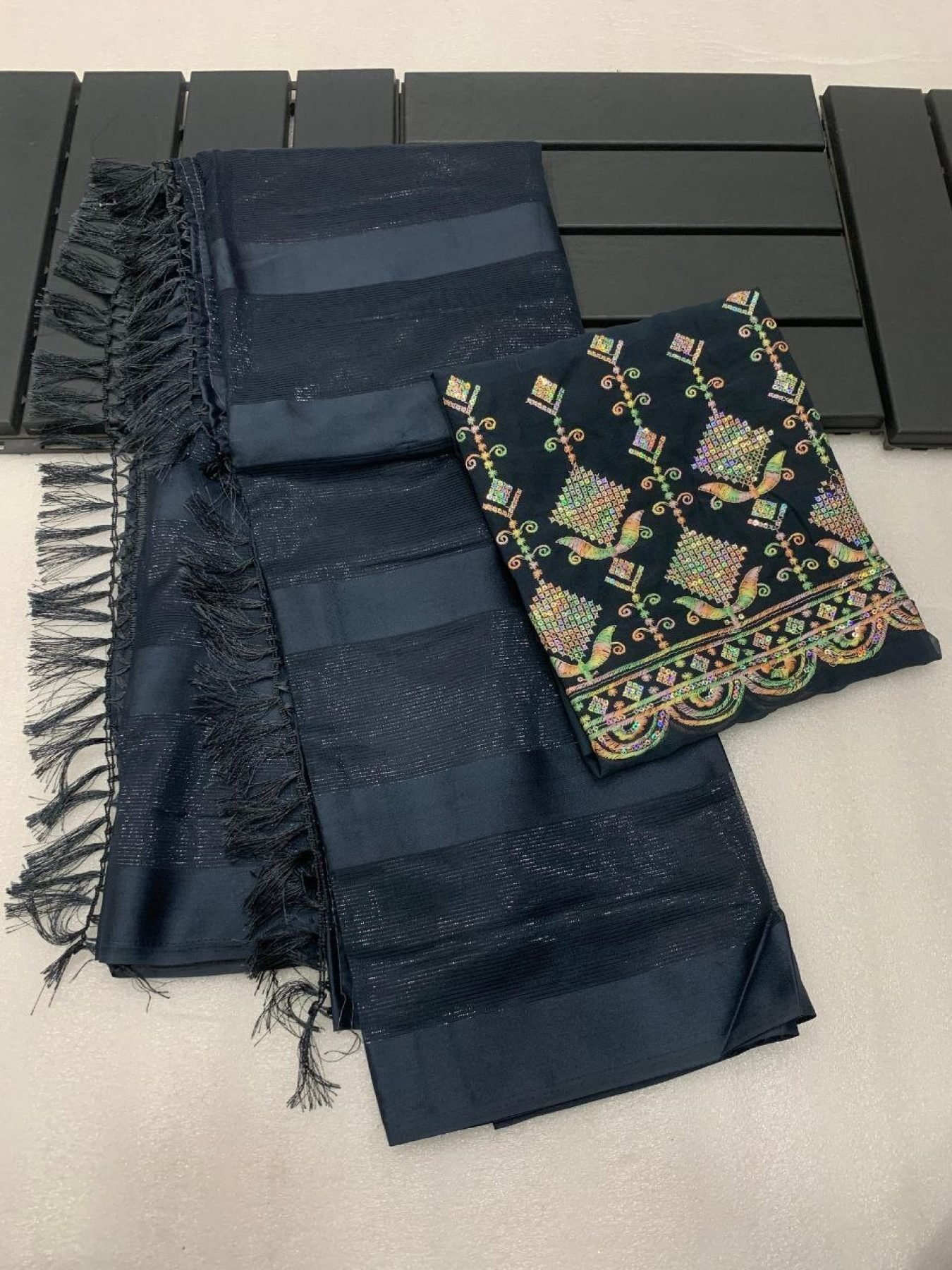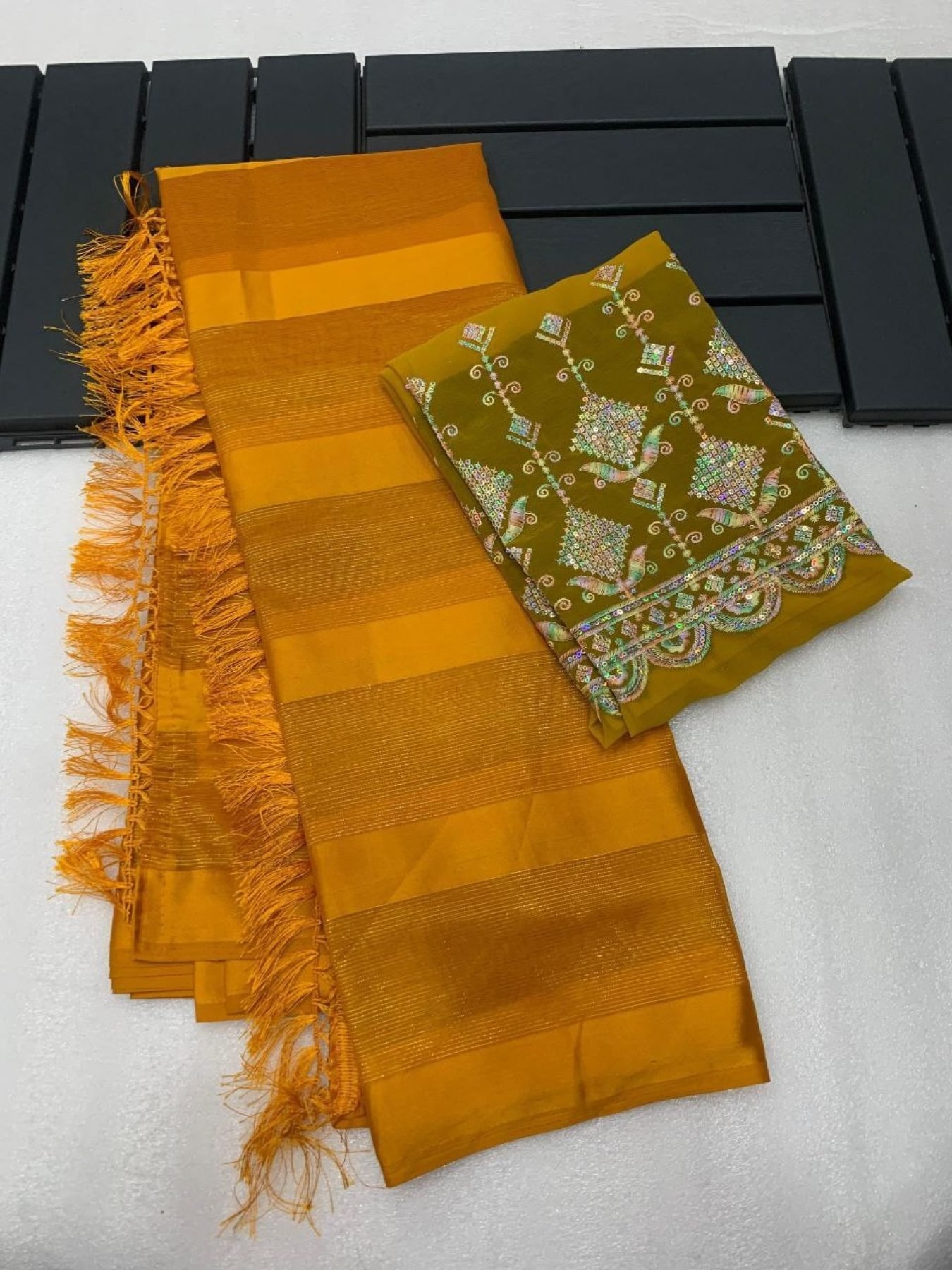 Elevate your wardrobe with our New Arrivals! This saree features a luxurious heavy golden chiffon silk fabric adorned with satin stripes and elegant tassels on the pallu, offering a regal and graceful look. Paired with a 60-gram georgette blouse embellished with intricate multi-thread and sequin work, this saree is perfect for festive occasions and celebrations. Available in six stunning colors, it guarantees sophistication and style for every event.