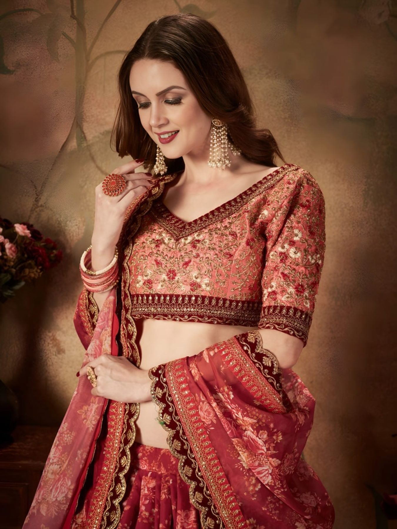 Elegant floral digital print organza lehenga paired with richly embroidered peach slub silk blouse and matching dupatta. A graceful wedding and festive wear ensemble with premium embroidery detailing.