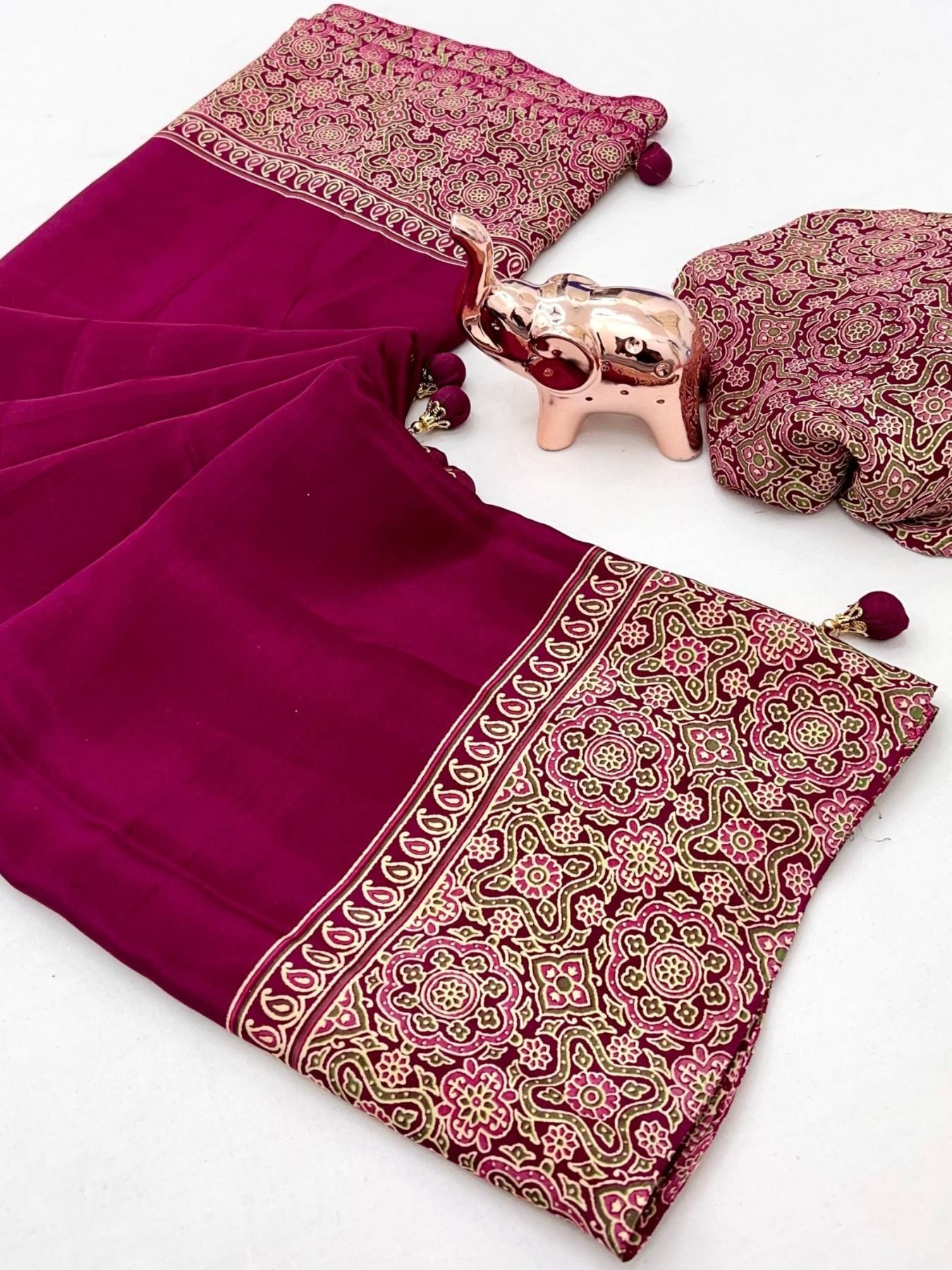 Wholesale Satin Saree Bold Ajrak Print Luxe Tassel Pallu Budget Friendly