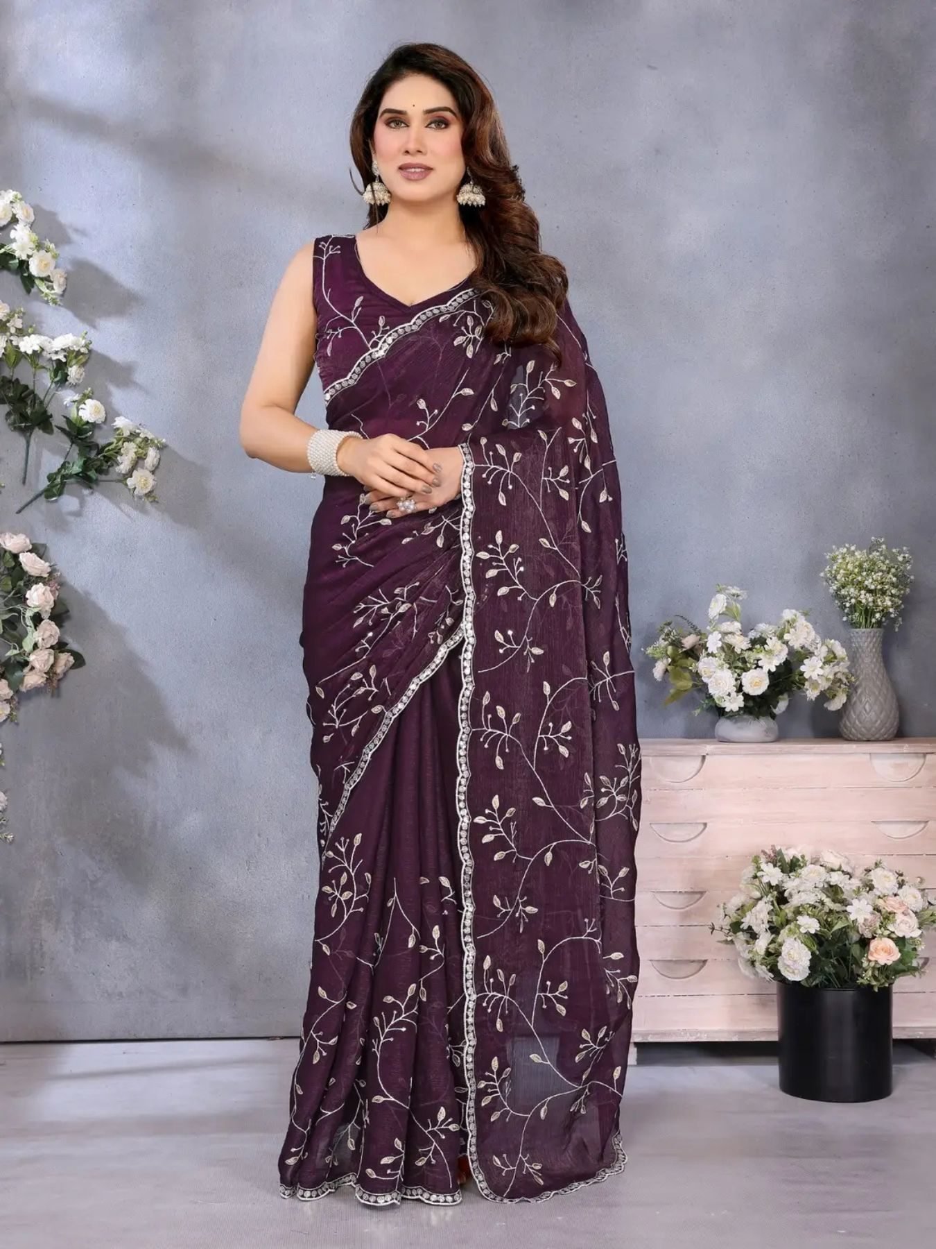 Wine hiffon Silk Saree With Delicate Floral Sequin Embroidery And Scalloped Border.