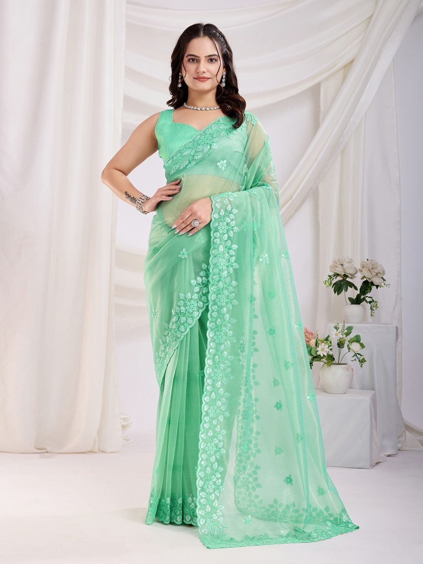 Women Beautiful Designer Embroidery Light Green Saree For Best Price
