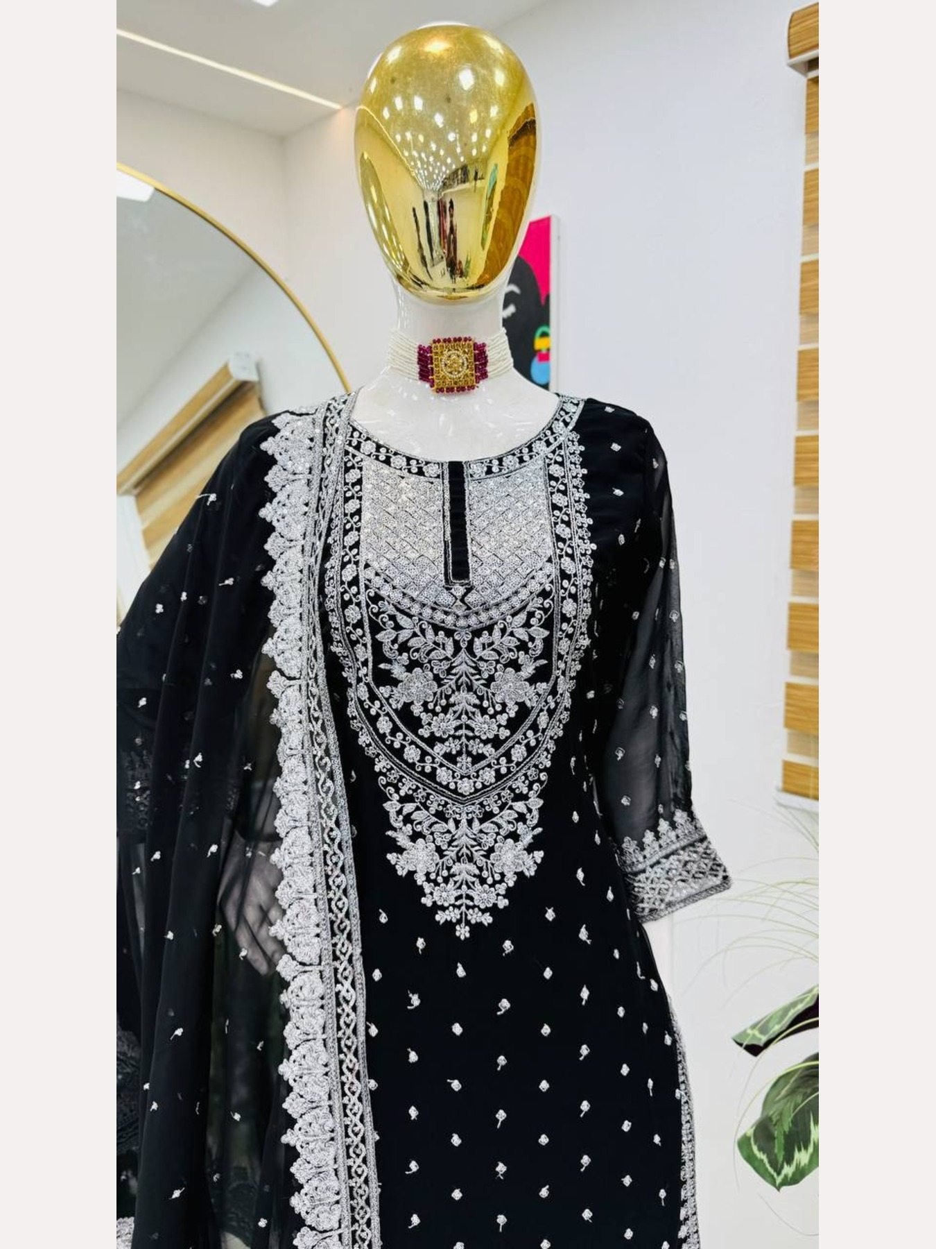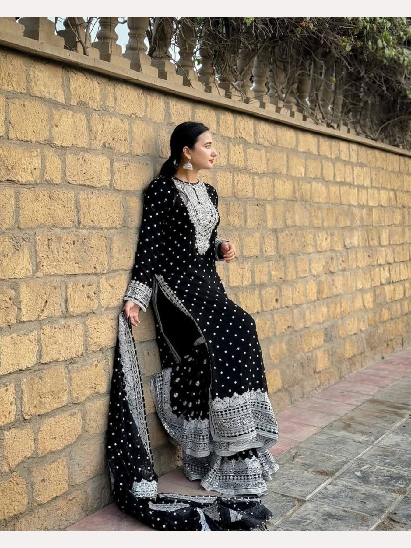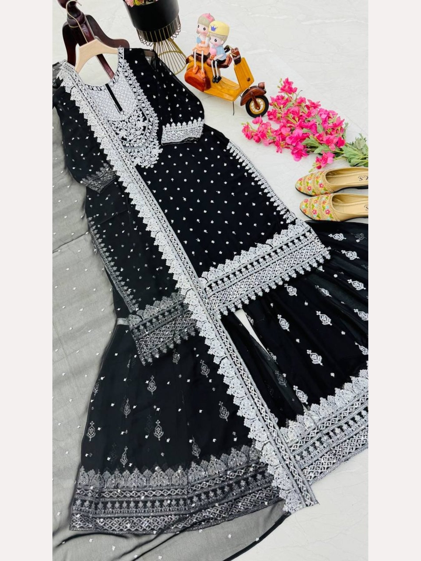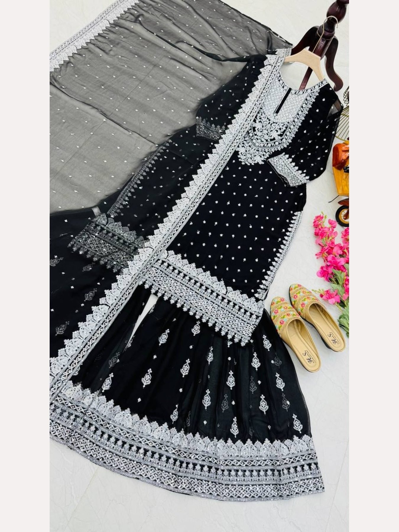 Women Black Designer Foux Georgette Embroidery and Sequence work Sharara set