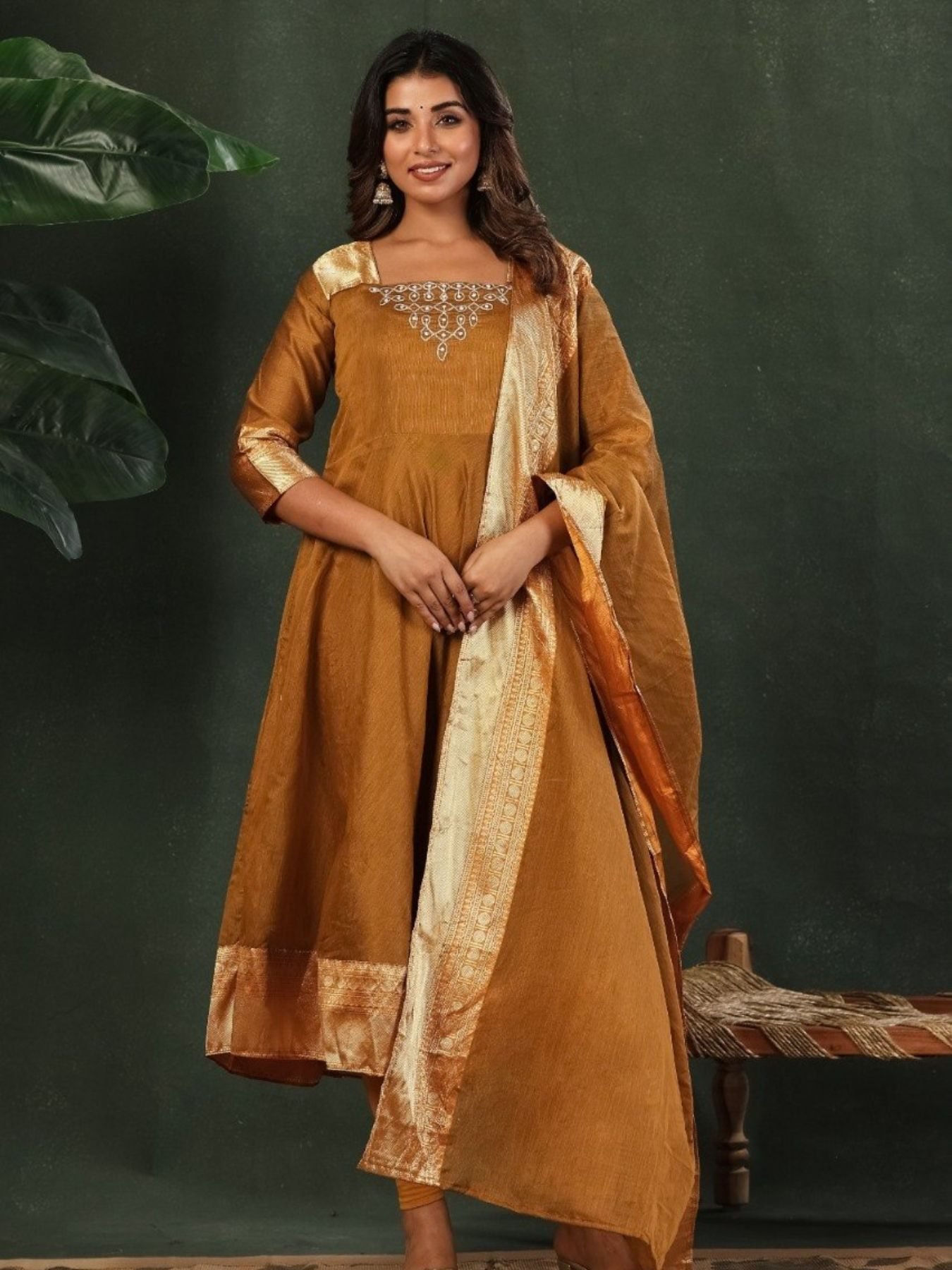 Women Golden Silk Blend Anarkali Kurta Set With Dupatta And Embroidered Neckline.