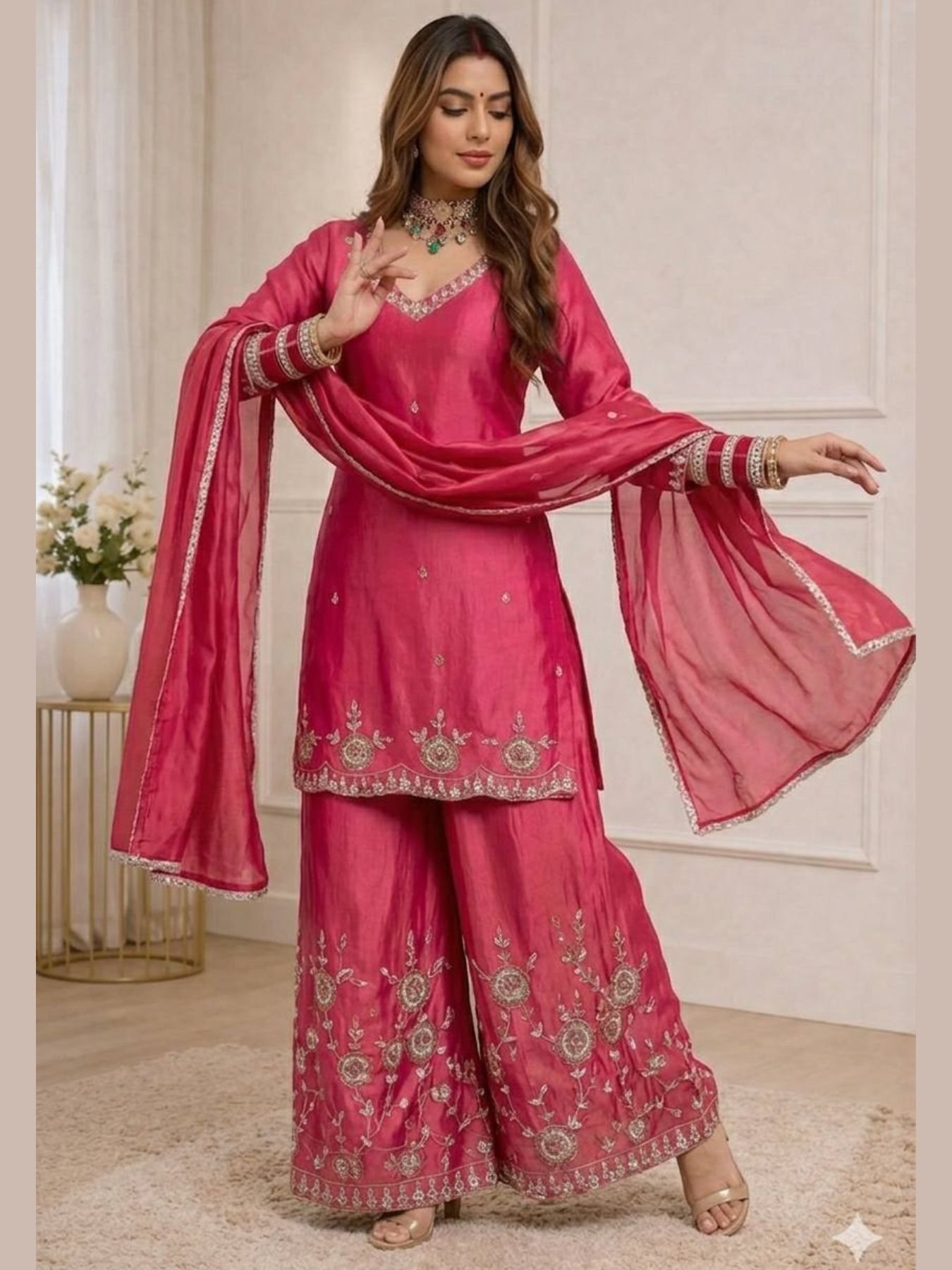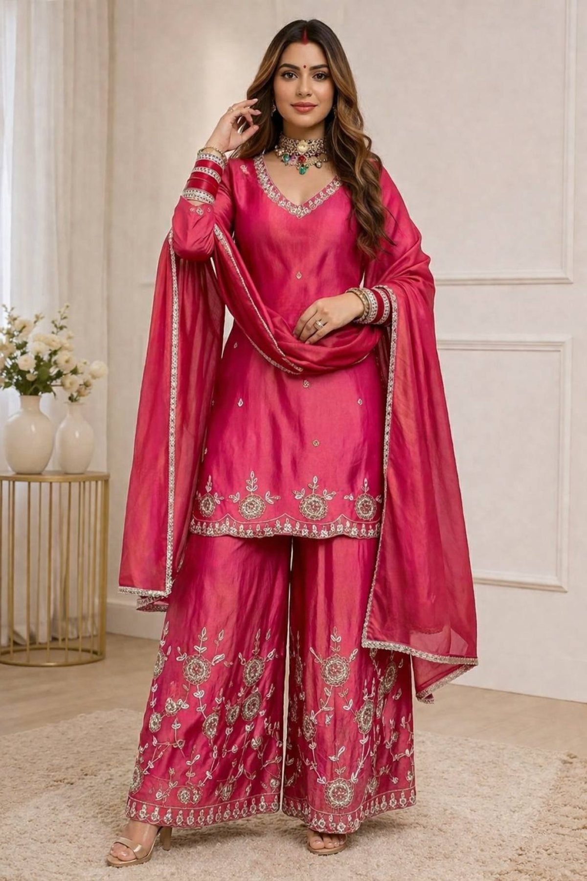 Women Hot Pink Chinon Silk Embroidery Work Kurta Sharara And Dupatta Set