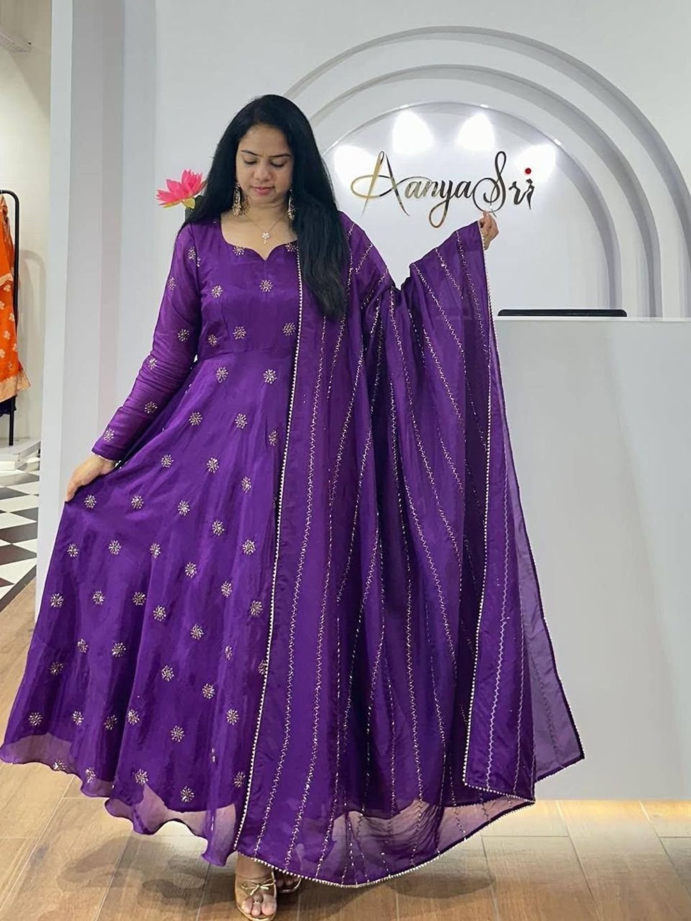The matching dupatta is adorned with a finely crafted border, adding an extra layer of sophistication. Whether you're looking for a graceful ethnic ensemble or a standout festive outfit, this traditional Indian Anarkali set is a must-have!